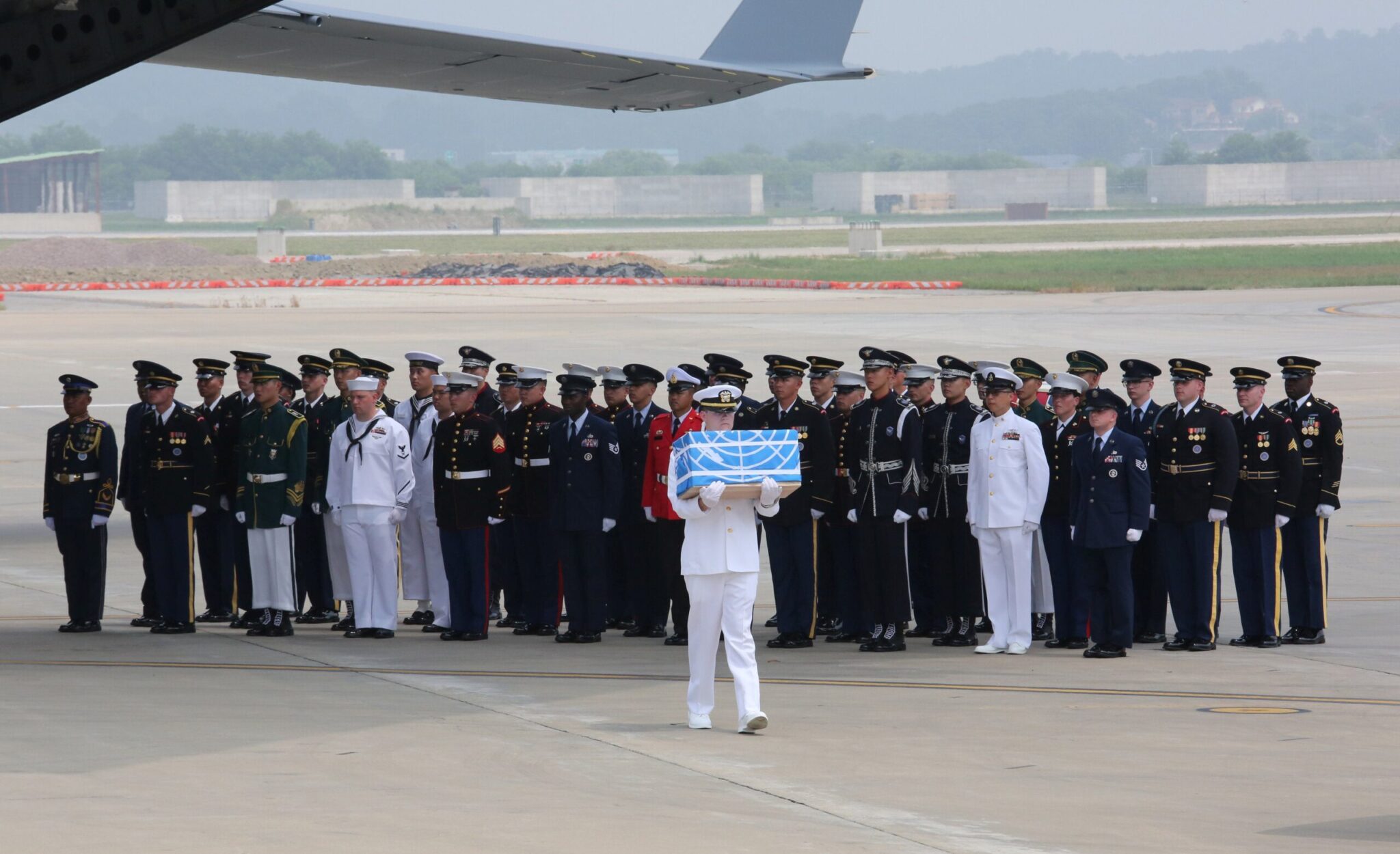 Στρατιωτικό μεταγωγικό αεροσκάφος, το οποίο μετέφερε τις σορούς αμερικανών στρατιωτών, πεσόντων κατά τη διάρκεια του Πολέμου της Κορέας (1950-53), που παραδόθηκαν στις ένοπλες δυνάμεις των ΗΠΑ από τις στρατιωτικές αρχές της Βόρειας Κορέας, προσγειώθηκε την Παρασκευή στη Νότια Κορέα, σύμφωνα με πλάνα που μετέδωσαν απευθείας τηλεοπτικά δίκτυα.