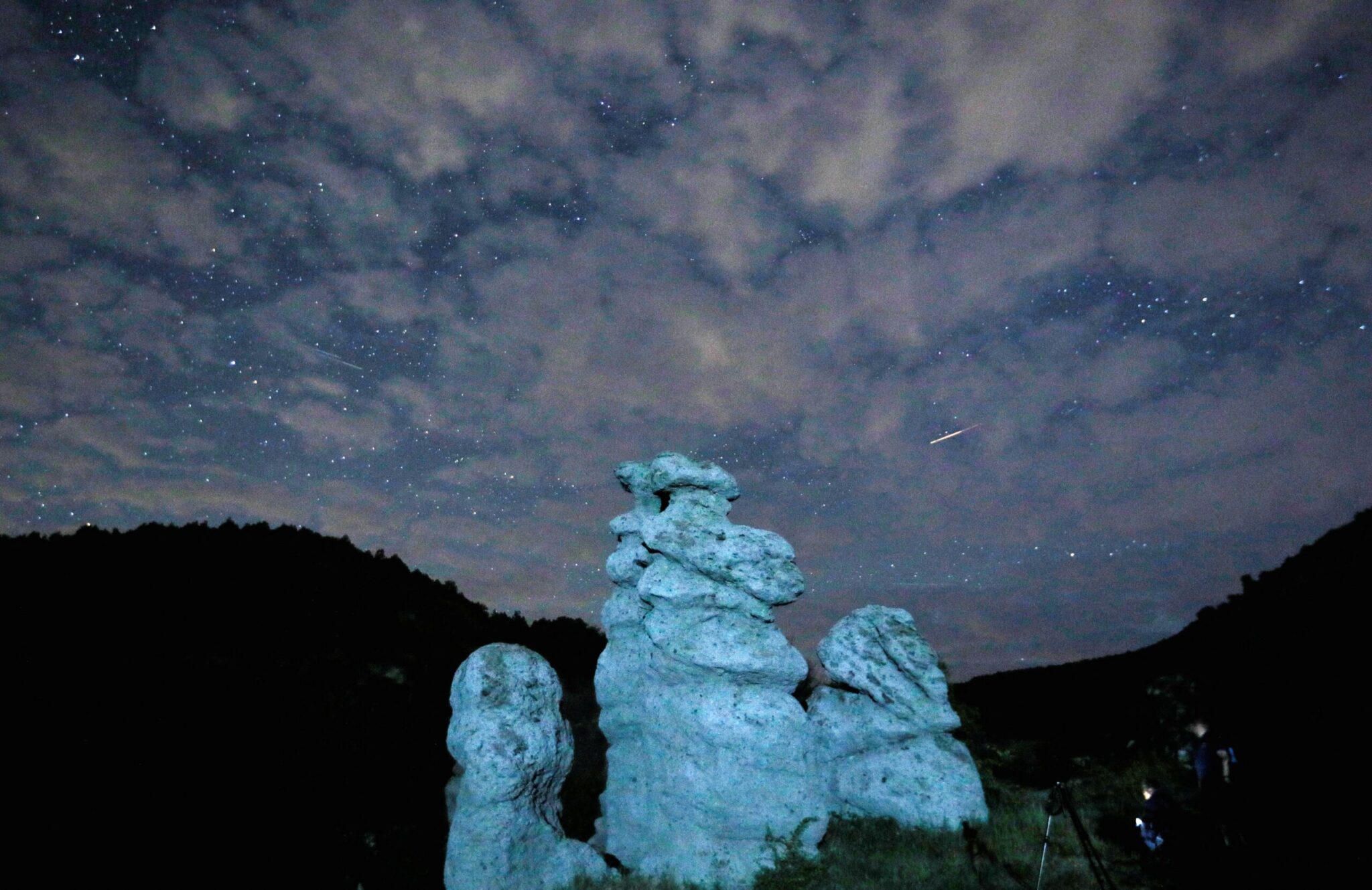 Ένας μετεωρίτης τρέχει κατά τη διάρκεια της βροχής μετεωριτών Περσείδων στον νυχτερινό ουρανό πάνω από το χωριό Kuklici, γνωστό για τις εκατοντάδες φυσικά σχηματισμένες πέτρες που μοιάζουν με ανθρώπινα όντα, κοντά στο Κράτοβο, Βόρεια Μακεδονία 13 Αυγούστου 2023OGNEN TEOFILOVSKI via REUTERS