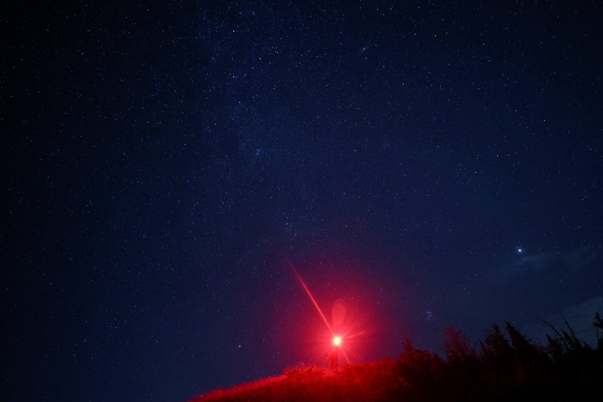 Ένας άνδρας χρησιμοποιεί φως λέιζερ προς τον ουρανό κατά τη διάρκεια της ετήσιας βροχής μετεωριτών Περσείδων στο Εθνικό Πάρκο Shebenik, στο Fushe Stude της Αλβανίας, 13 Αυγούστου 2023.