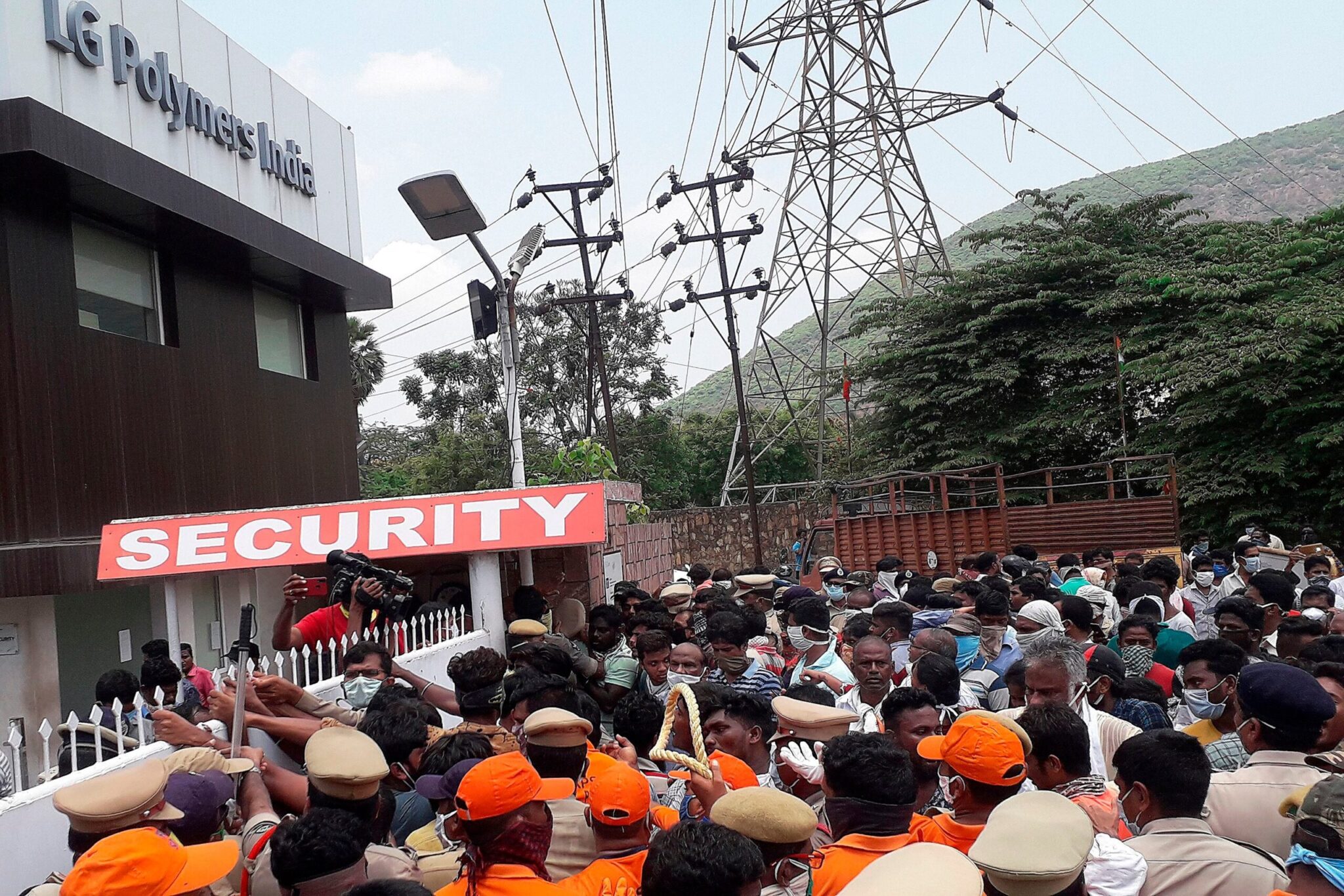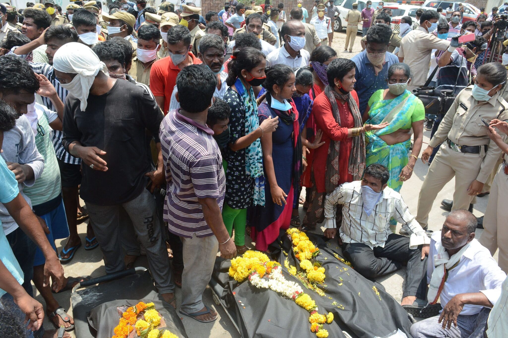 Ινδοί αξιωματούχοι πήγαν το Σάββατο στην περιοχή για να ελέγξουν τις συνθήκες ασφαλείας στο εργοστάσιο της LG Polymers, θυγατρικής της νοτιοκορεατικής εταιρείας LG Chemical, όταν βρέθηκαν αντιμέτωποι με ένα πλήθος περίπου 300 ανθρώπων. Κάποιοι από τους συγκεντρωμένους μετέφεραν μαζί τους τρία πτώματα θυμάτων, τα οποία είχαν παραλάβει νωρίτερα από το νεκροτομείο και τα μετέφεραν πάνω σε φορεία, μέσα σε μαύρες σακούλες.