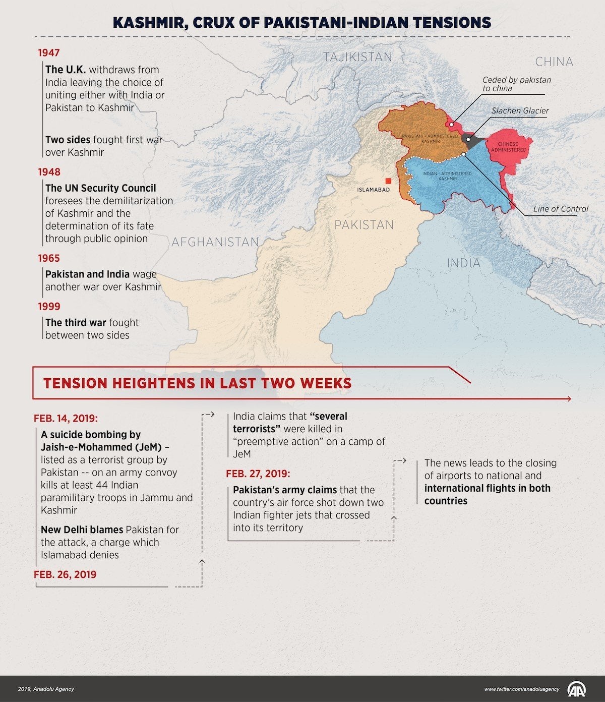 Το τελευταίο μεγάλο πλήγμα στις σχέσεις τους ήρθε μετά την επίθεση βομβιστή-καμικάζι στο Κασμίρ, στις 14 Φεβρουαρίου, όταν σκοτώθηκαν 40 ινδοί χωροφύλακες, η οποία αποδόθηκε στην οργάνωση Jaish-e-Mohammed. Έκτοτε η ένταση ανέβηκε κατακόρυφα με εκατέρωθεν δηλώσεις παρά τις εκκλήσεις των ΗΠΑ για ηρεμία και αυτοσυγκράτηση.