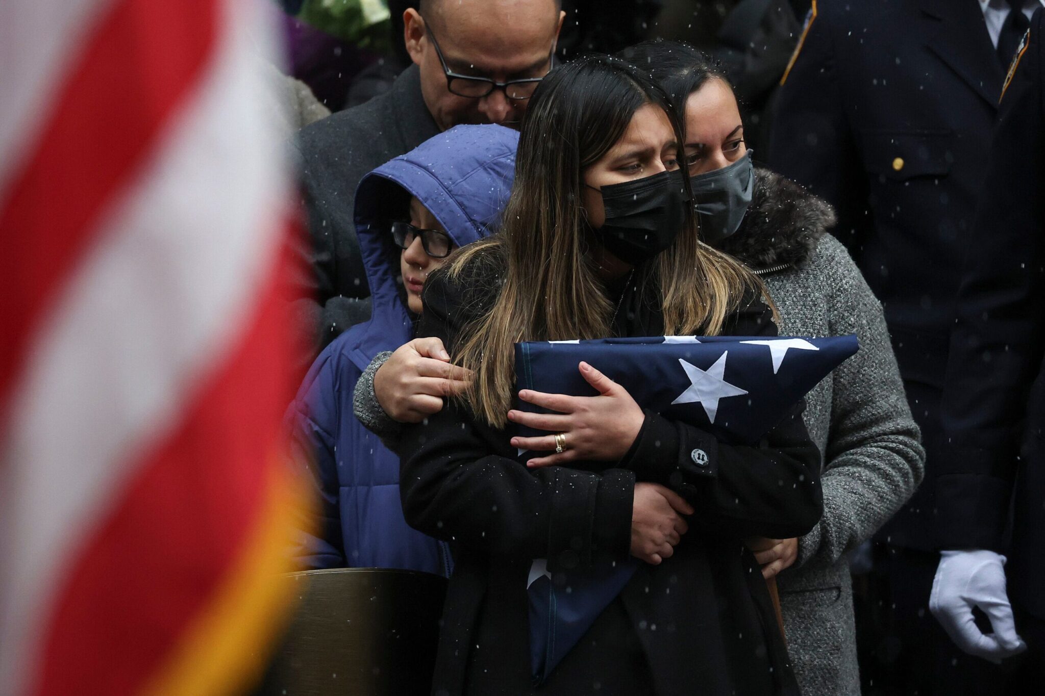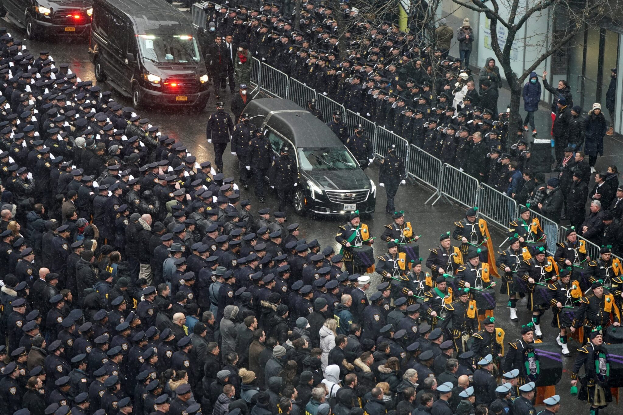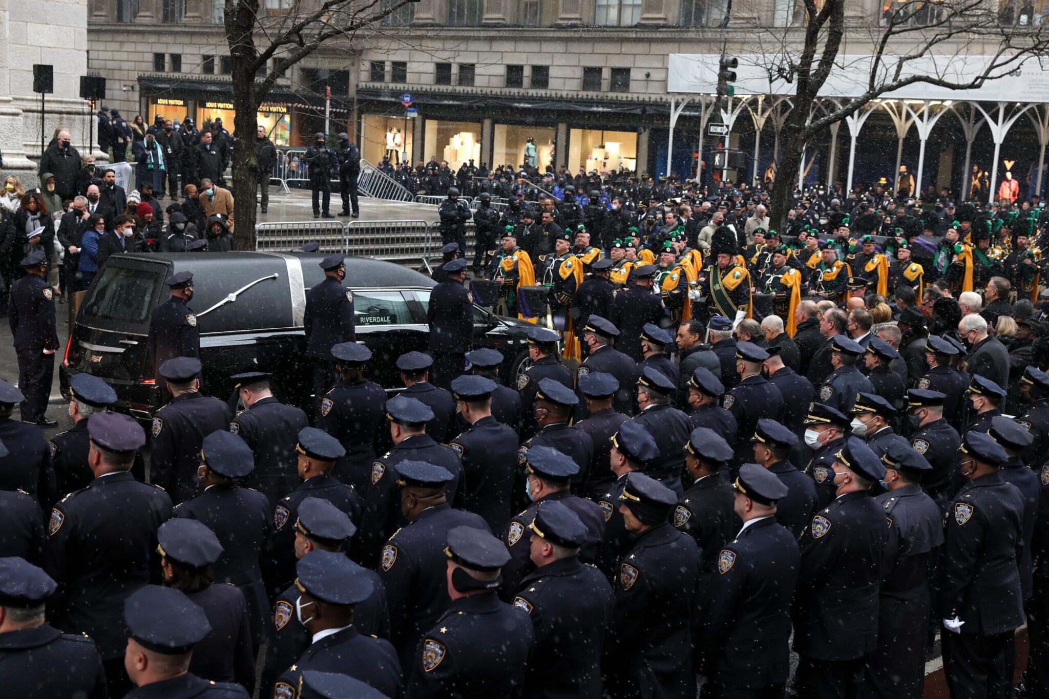 Αστυνομικοί ντυμένοι με μπλε στολές και φορώντας λευκά γάντια μετέφεραν το καλυμμένο με την αμερικανική σημαία φέρετρο του Τζέισον Ριβέρα, 22 ετών, ενός από τους 4 αστυνομικούς που δέχθηκαν πυρά την περασμένη εβδομάδα, στο πλαίσιο της νεκρώσιμης ακολουθίας που τελέστηκε στον ναό του Αγίου Πατρικίου στο Μανχάταν.