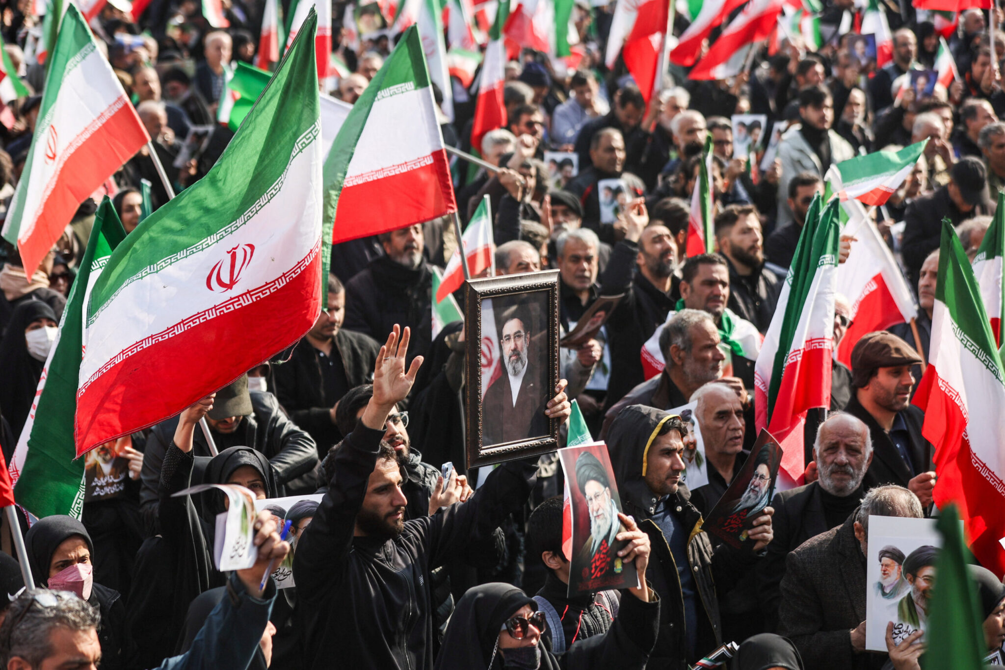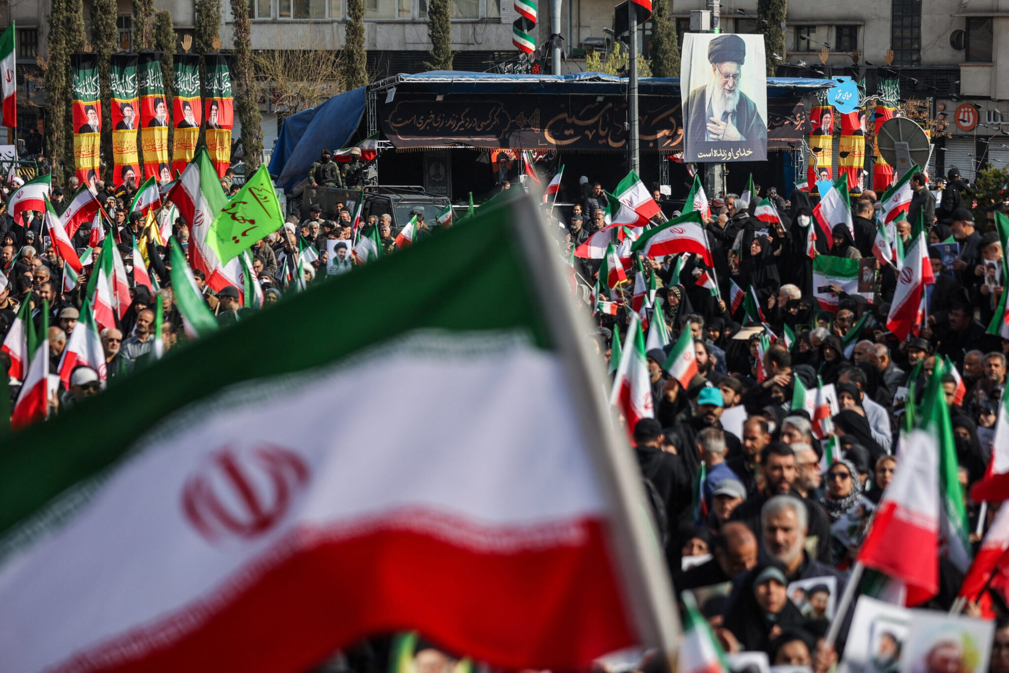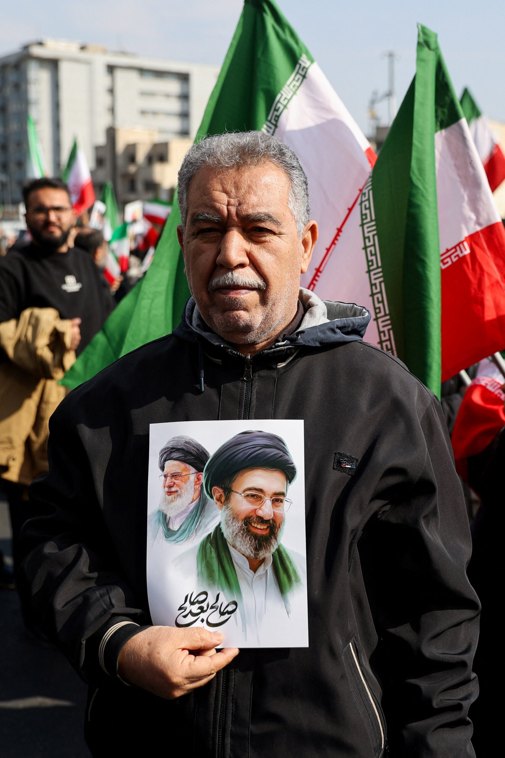 Το πλήθος συγκεντρώθηκε στην πλατεία Ενγκελάμπ στην Τεχεράνη κρατώντας ιρανικές σημαίες και πορτρέτα του Μοζτάμπα Χαμενεΐ, γιου του Αλί Χαμενεΐ, ο οποίος κατείχε προηγουμένως τη θέση αυτή και σκοτώθηκε την πρώτη ημέρα των αμερικανοϊσραηλινών πληγμάτων εναντίον του Ιράν.