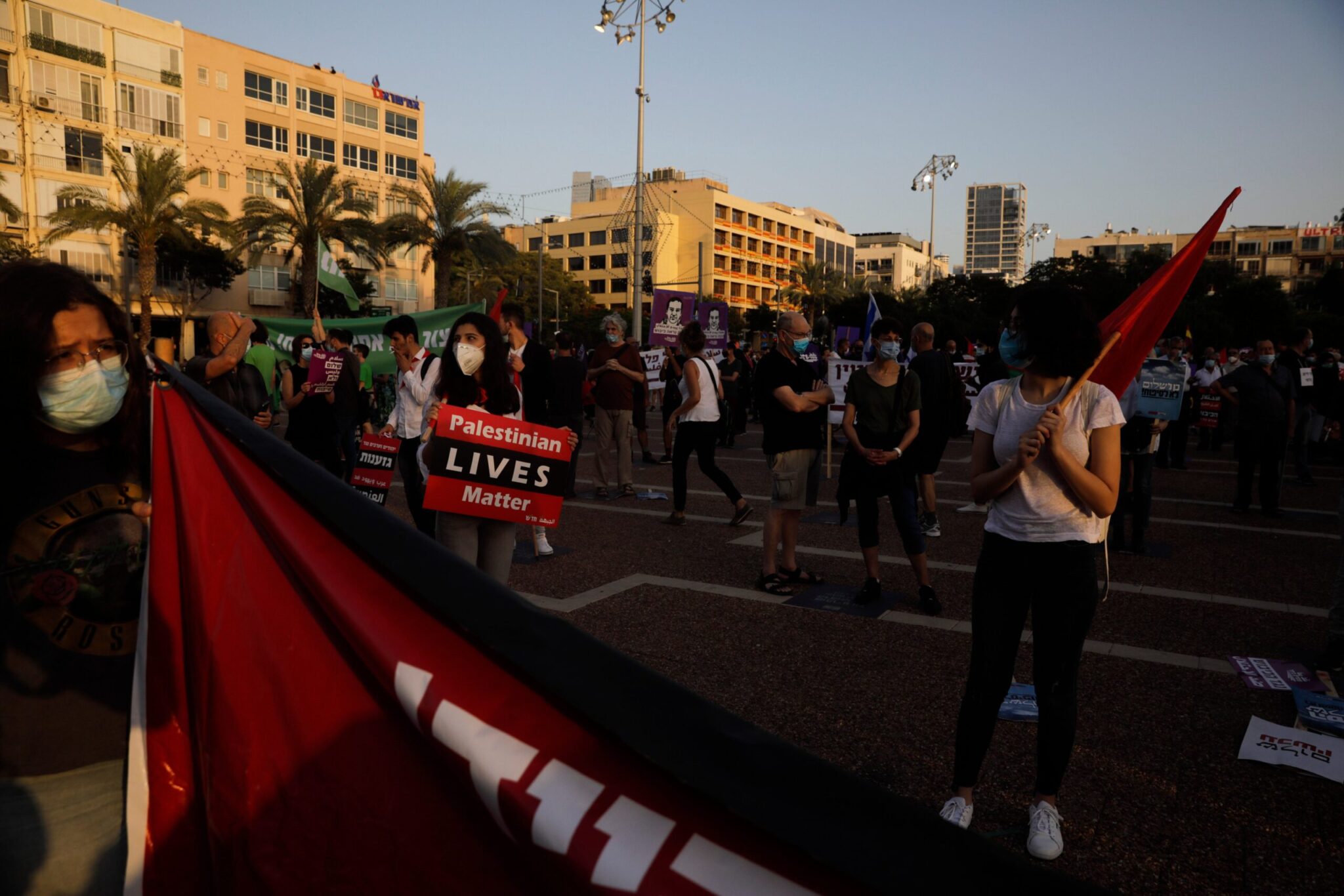 Φορώντας μάσκες, κρατώντας μεταξύ τους αποστάσεις στο πλαίσιο των μέτρων προφύλαξης κατά του κορονοϊού, οι διαδηλωτές, κυματίζοντας σημαίες της Παλαιστίνης και του Ισραήλ, συγκεντρώθηκαν στην Πλατεία Ραμπίν στο Τελ Αβίβ το Σάββατο βράδυ με πανό που έγραφαν «Οι ζωές των Παλαιστινίων μετρούν» και «Μην κάνετε το Απαρτχάιντ σπουδαίο ξανά». Κεντρικό σύνθημα: «Όχι στην προσάρτηση, όχι στην κατοχή, ναι στην ειρήνη και την δημοκρατία».