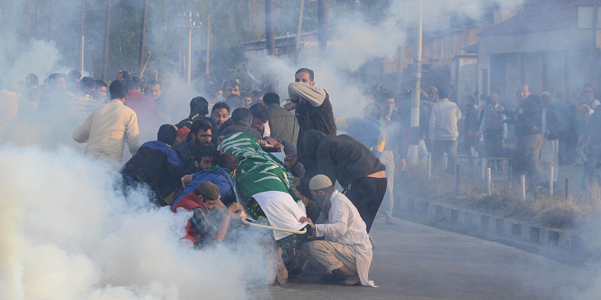 INDIA - 2016/10/08: People try to protect the dead body of 12 year old boy Junaid Ahmad after Indian police resorted to heavy teargas shelling in Srinagar the summer capital of Indian controlled Kashmir on October 08, 2016. Indian police resorted to intense teargas shelling on people in Eidgah area of Srinagar who were heading to bury the dead body of Ahmad. Junaid was shot dead after Indian police fired pellets in his head and chest without any provocation, local residents said. (Photo by Faisal Khan/Pacific Press/LightRocket via Getty Images)