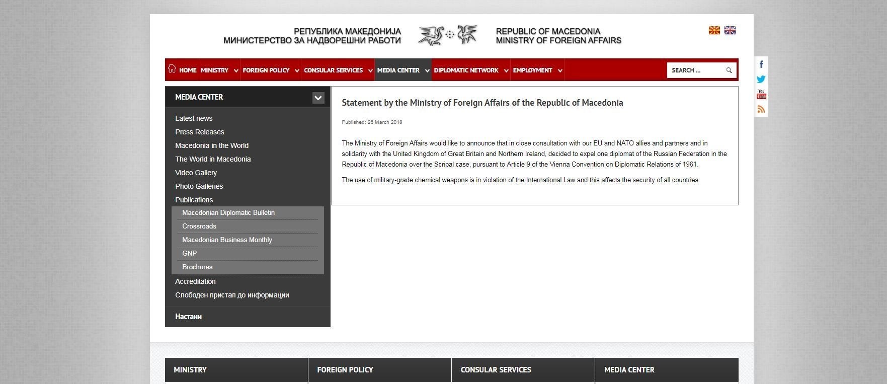 Το υπουργείο Εξωτερικών της ΠΓΔΜ ανακοίνωσε ότι προχωρά στην απέλαση ενός Ρώσου διπλωμάτη από τα Σκόπια για την υπόθεση δηλητηρίασης του πρώην πράκτορα Σεργκέι Σκριπάλ σε βρετανικό έδαφος.