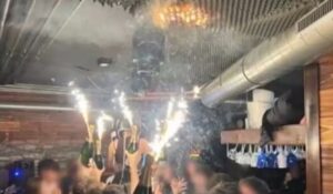 Στο βίντεο διακρίνεται σερβιτόρα του μπαρ στο Κραν Μοντανά της Ελβετίας, φορώντας κράνος, πάνω στους ώμους ενός ατόμου, να κρατάει δύο μπουκάλια σαμπάνιας στα οποία είναι τοποθετημένα τα βεγγαλικά.