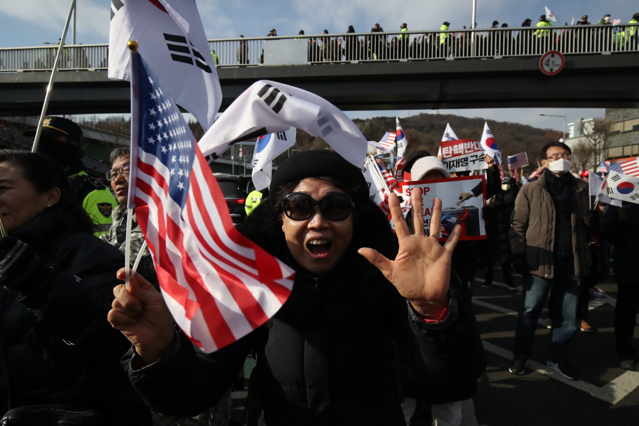 Εκατοντάδες οπαδοί του κ. Γιουν, ανάμεσά τους γνωστοί youtubers της άκρας δεξιάς, καθώς και ευαγγελικοί χριστιανοί ιερωμένοι, είχαν κατασκηνώσει κοντά στην επίσημη προεδρική κατοικία τη νύχτα της Πέμπτης προς Παρασκευή και ορισμένοι οργάνωσαν νυχτερινές προσευχές υπέρ του ηγέτη τους.