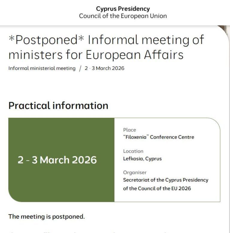 Μετά τις τελευταίεε εξελίξεις έγινε γνωστό ότι αναβάλλεται η Άτυπη Σύνοδος των Υπουργών Ευρωπαϊκών Υποθέσεων της Ευρωπαϊκής Ένωσης (ΕΕ) που ήταν προγραμματισμένη να πραγματοποιηθεί στη Λευκωσία σήμερα και αύριο (2-3 Μαρτίου) στο πλαίσιο της Κυπριακής Προεδρίας του Συμβουλίου της ΕΕ 2026.