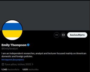 Όσον αφορά το εν λόγω προφίλ, αυτό ανήκει στην Emily Thompson, όπως είναι το όνομα του λογαριασμού, με αντικείμενο την αμερικανική εσωτερική και εξωτερική πολιτική. Στο βιογραφικό του συγκεκριμένου προφίλ αναφέρεται χαρακτηριστικά: «Είμαι μια ανεξάρτητη ερευνήτρια, αναλύτρια και λέκτορας, με κύρια εστίαση στις εσωτερικές και εξωτερικές πολιτικές των ΗΠΑ».