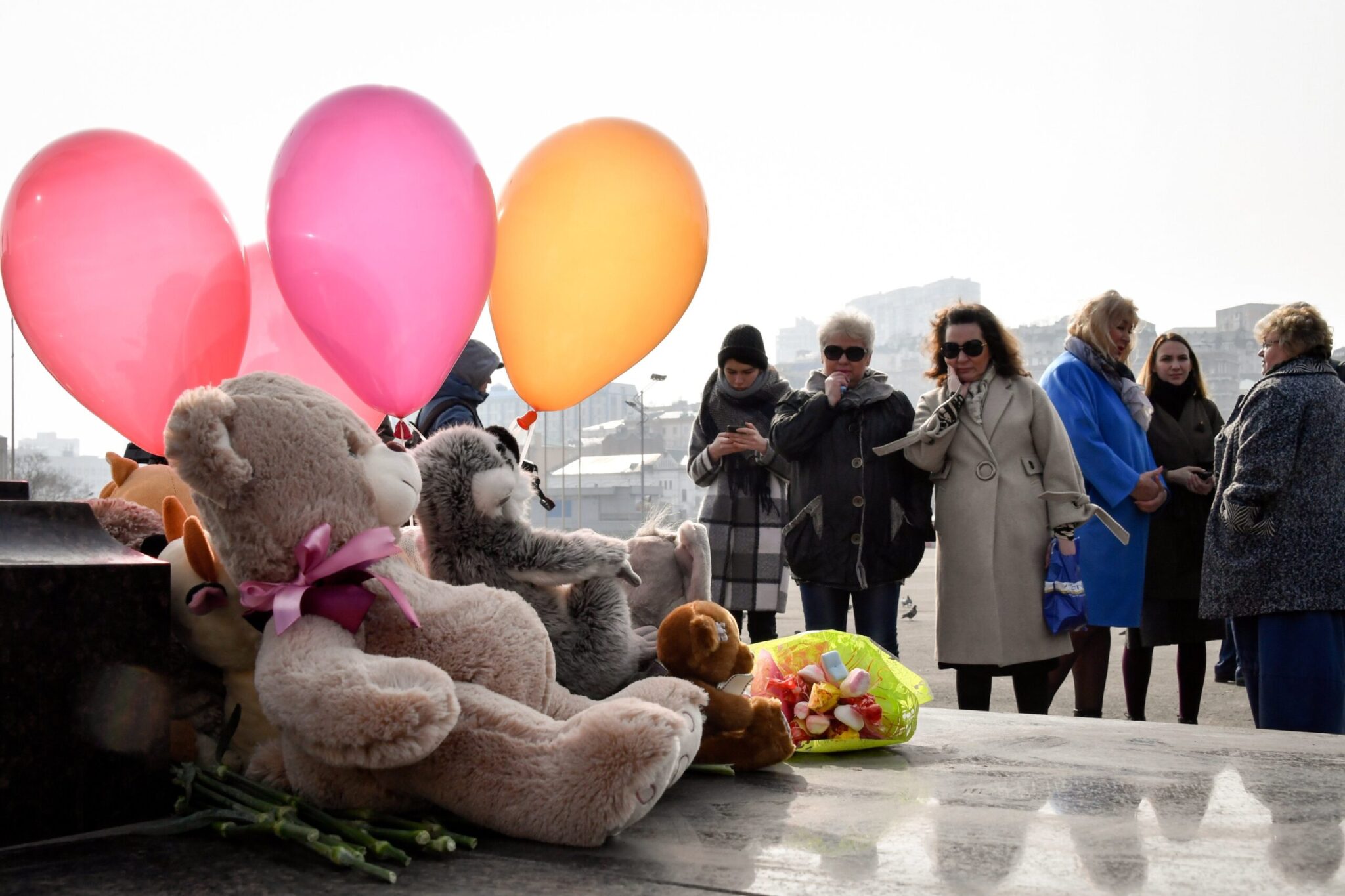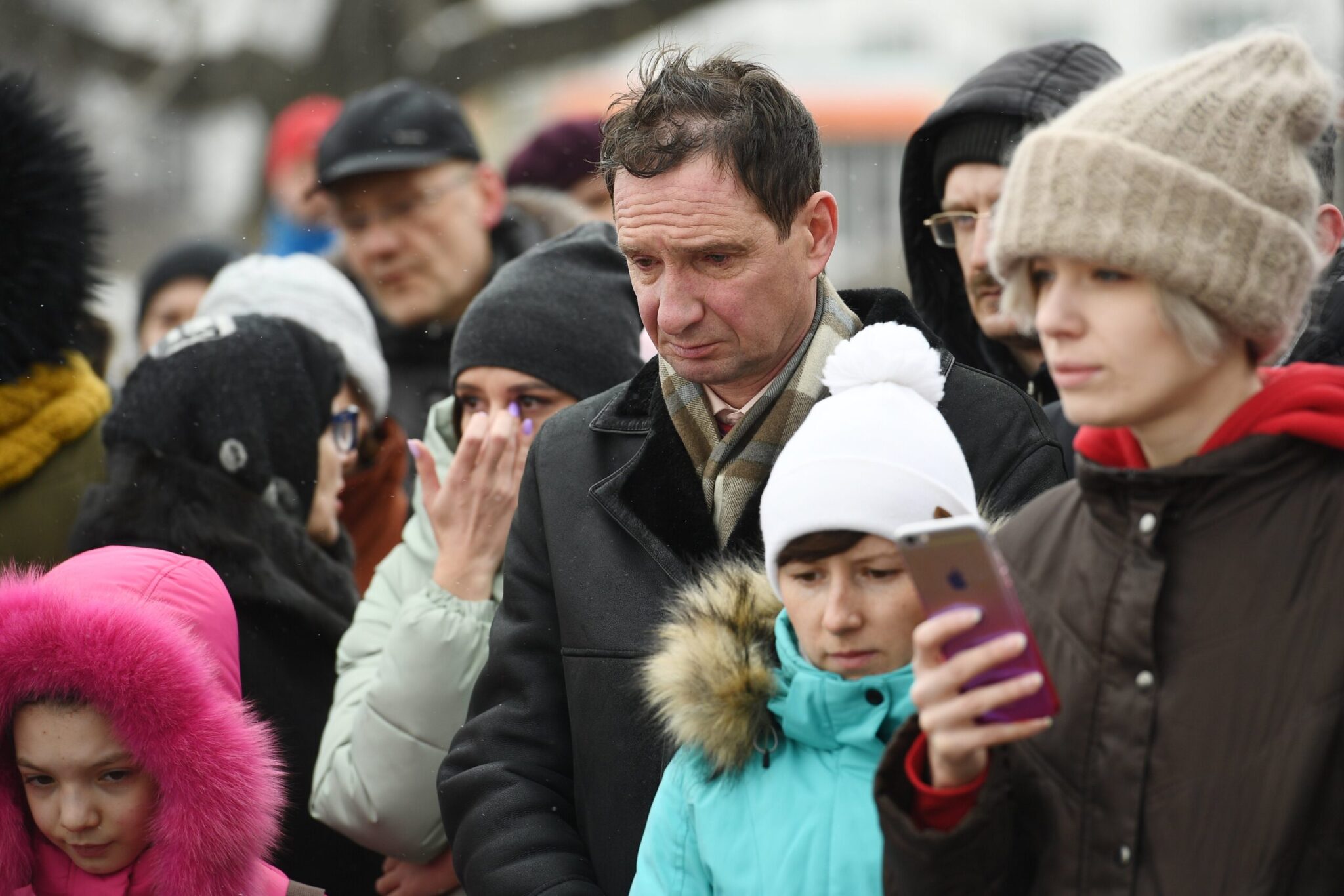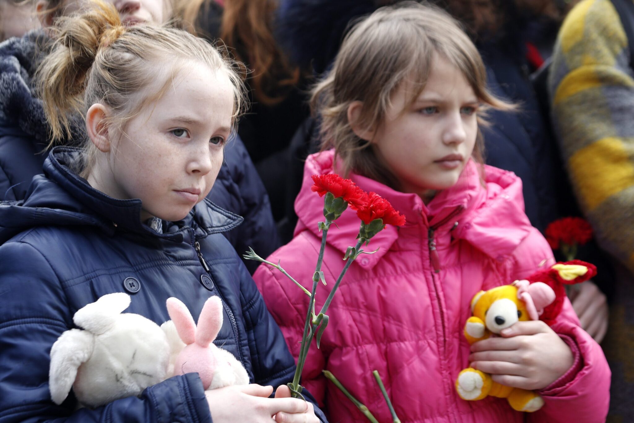 Η Νατάλια και ο Σεργκέι Αγκάρκοφ, τα δύο παιδιά των οποίων έχασαν τη ζωή τους μαζί με την γιαγιά τους στην πυρκαγιά στο εμπορικό κέντρο, στέκονταν στην πλατεία κρατώντας φωτογραφίες των αγαπημένων τους.