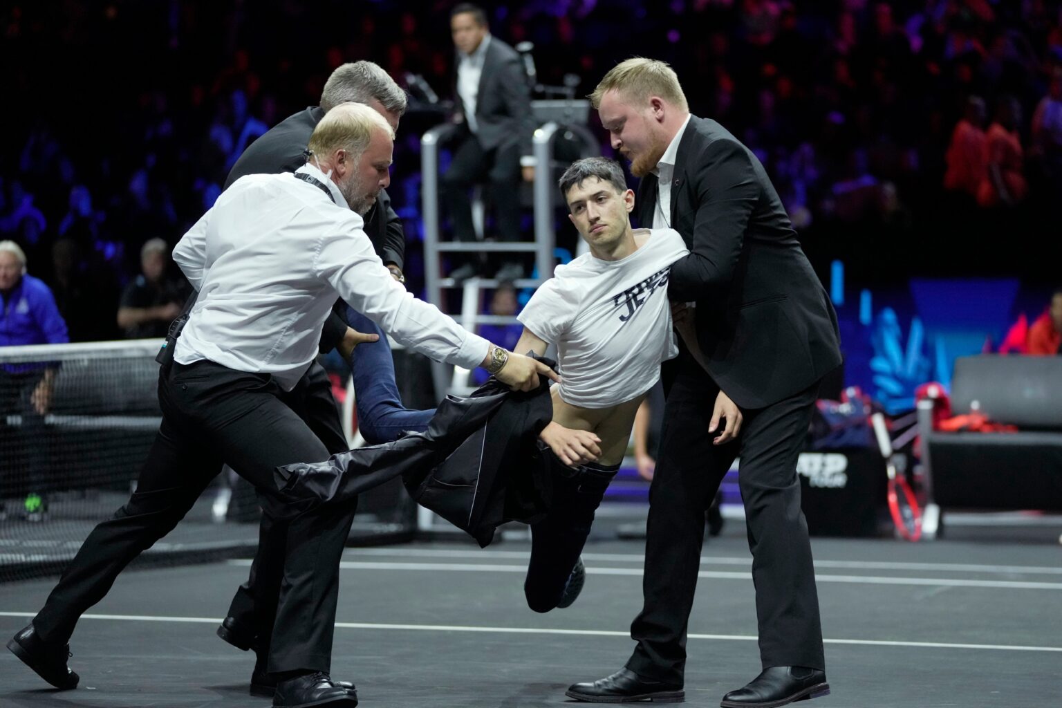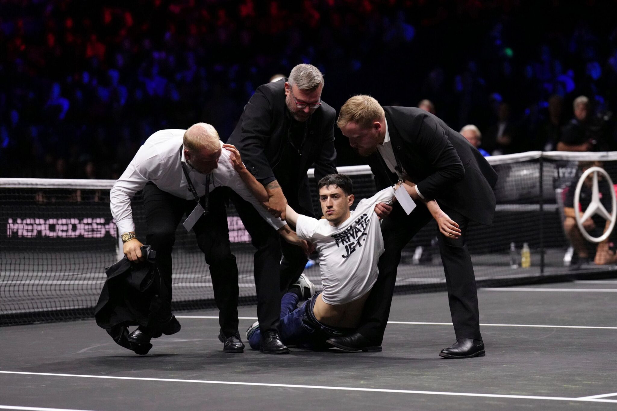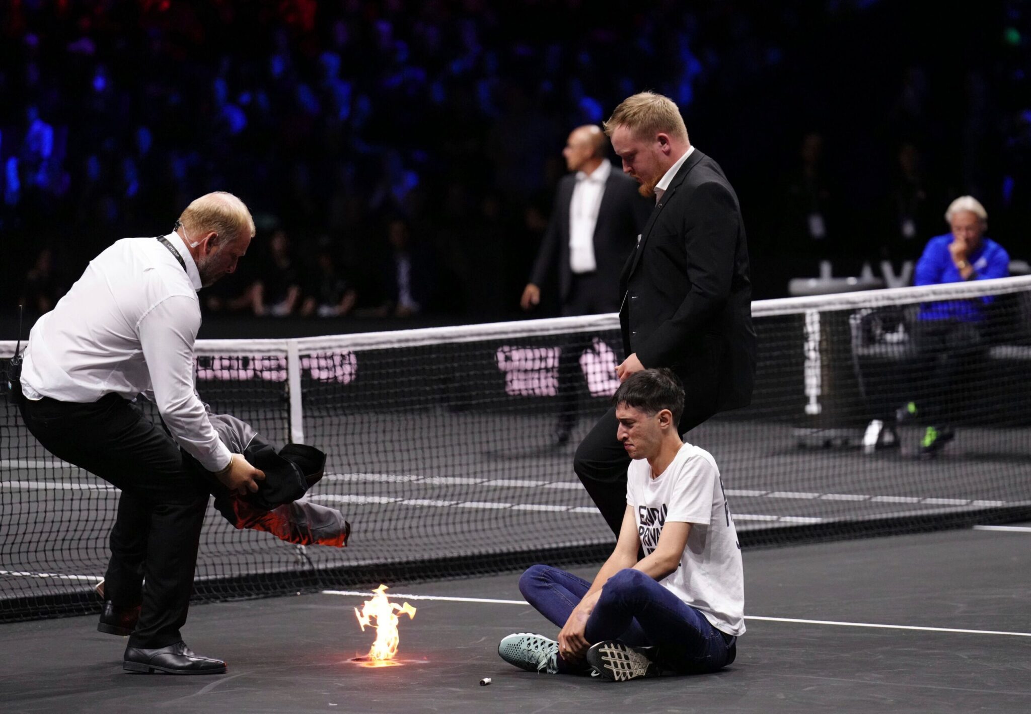 Η έναρξη του φετινού τουρνουά τένις Laver Cup στο Λονδίνο επισκιάστηκε από έναν διαδηλωτής έβαλε φωτιά στο χέρι του κατά τη διάρκεια του αγώνα του Στέφανου Τσιτσιπά με τον Ντιέγκο Σβάρτζμαν.