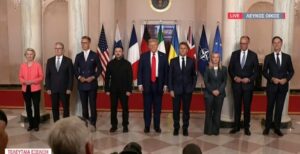 Αμέσως μετά το τέλος της κατ’ ιδίαν συνάντησης Τραμπ – Ζελένσκι, οι δύο άνδρες συνάντησαν τους Ευρωπαίους ηγέτες. Αρχικώς έβγαλαν τη λεγόμενη «οικογενειακή φωτογραφία» και κατόπιν μετέβησαν στην αίθουσα όπου θα συνεδριάσουν με τον Αμερικανό πρόεδρο.