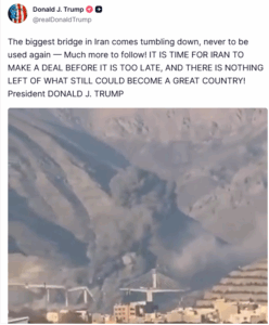 Ο πρόεδρος των ΗΠΑ Ντόναλντ Τραμπ κοινοποίησε νωρίτερα μέσω Truth Social βίντεο που δείχνει την καταστροφή «της μεγαλύτερης γέφυρας στο Ιράν» σε βομβαρδισμό, σχολιάζοντας πως είναι ώρα η Τεχεράνη να συνάψει συμφωνία «προτού να είναι πολύ αργά».