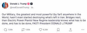 Οι αμερικανικές ένοπλες δυνάμεις «δεν έχουν καν αρχίσει να καταστρέφουν ό,τι έχει μείνει στο Ιράν. Οι γέφυρες επόμενες, μετά οι σταθμοί ηλεκτροπαραγωγής» έγραψε στα social media, προσθέτοντας πως η ιρανική ηγεσία «ξέρει τι πρέπει να γίνει, και πρέπει να γίνει γρήγορα!».