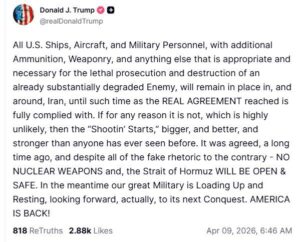 «Αν για οποιονδήποτε λόγο δεν το κάνει, που είναι πολύ απίθανο, τότε αρχίζει ξανά το πυρ, μεγαλύτερο, καλύτερο και δυνατότερο από ό,τι έχει δει κανείς ποτέ στο παρελθόν. Συμφωνήθηκε, πολύ καιρό πριν και παρά όλη την ψευδή ρητορική για το αντίθετο – ΟΧΙ ΠΥΡΗΝΙΚΑ ΟΠΛΑ και τα Στενά του Ορμούζ θα είναι ανοιχτά και ασφαλή. Στο μεταξύ οι θαυμαστές ένοπλες δυνάμεις μας ετοιμάζονται και ξεκουράζονται, ανυπομονώντας, για την ακρίβεια, για την επόμενη κατάκτησή τους. Η ΑΜΕΡΙΚΗ ΕΠΕΣΤΡΕΨΕ!».