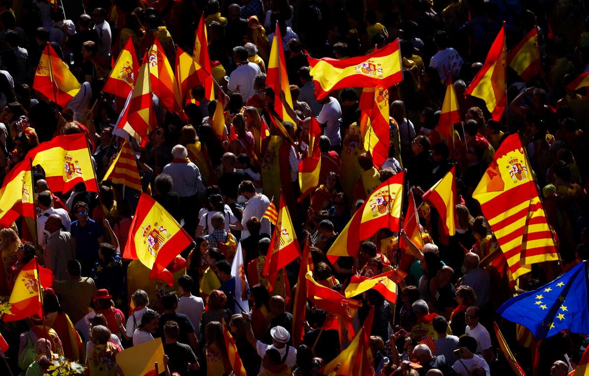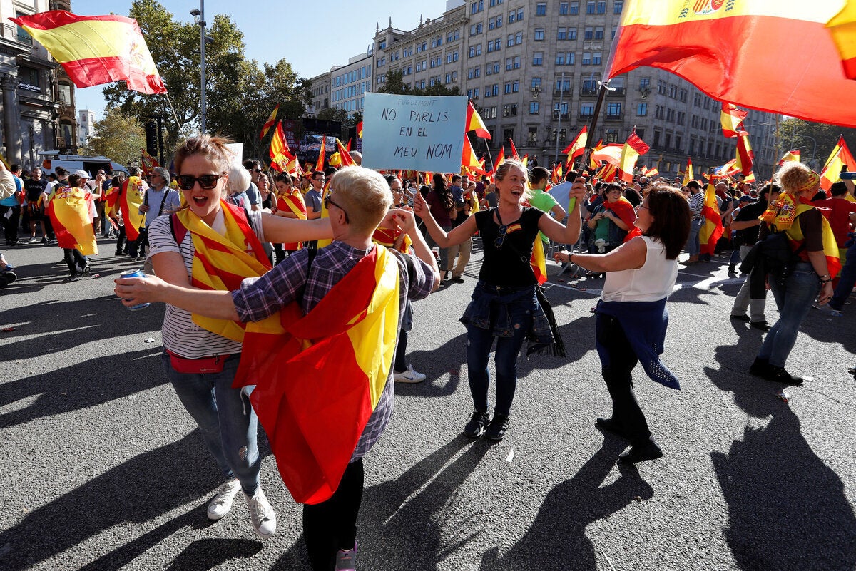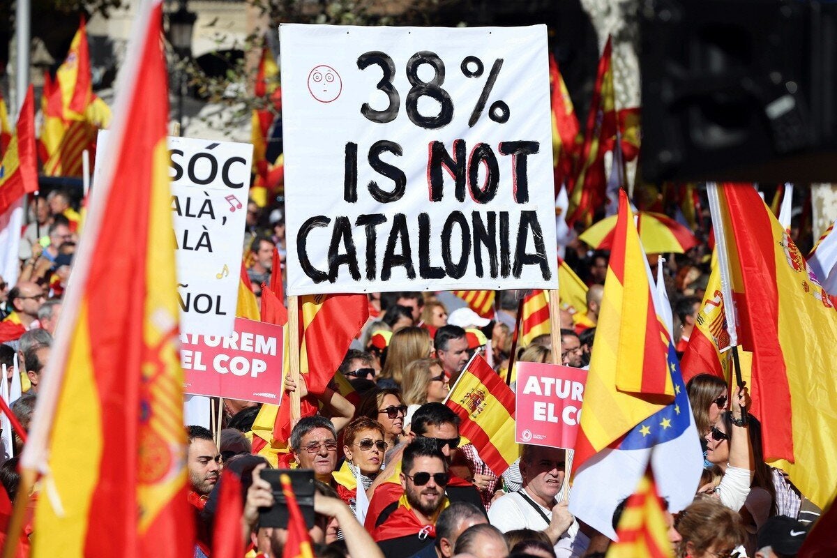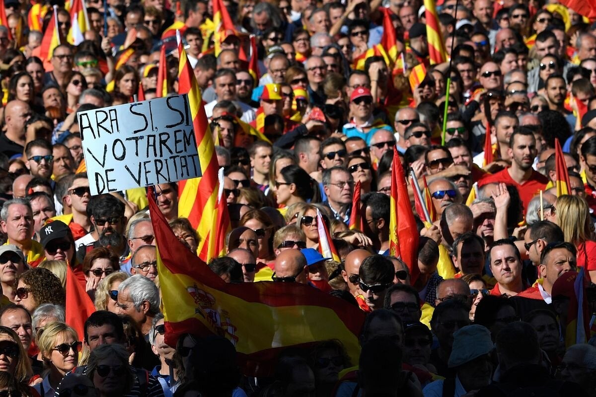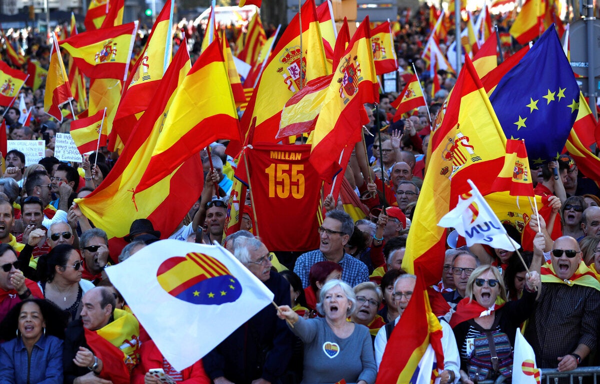 Εκατοντάδες χιλιάδες Καταλανοί οπαδοί της ενότητας της Ισπανίας διαδηλώνουν στους δρόμους της Βαρκελώνης, δύο ημέρες μετά την κήρυξη της ανεξαρτησίας από το καταλανικό κοινοβούλιο, η οποία σηματοδότησε μια πρωτοφανή ρήξη σε 40 χρόνια δημοκρατίας.