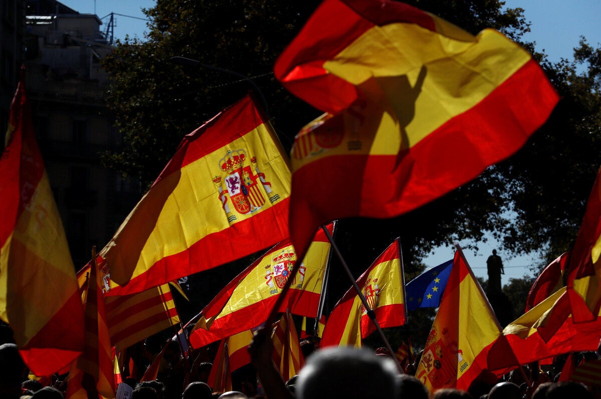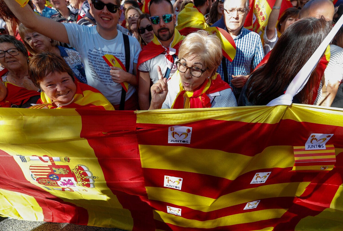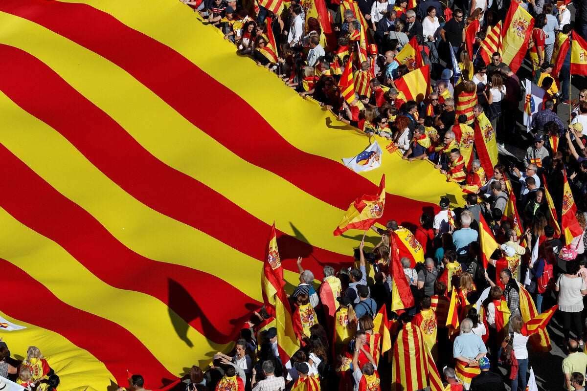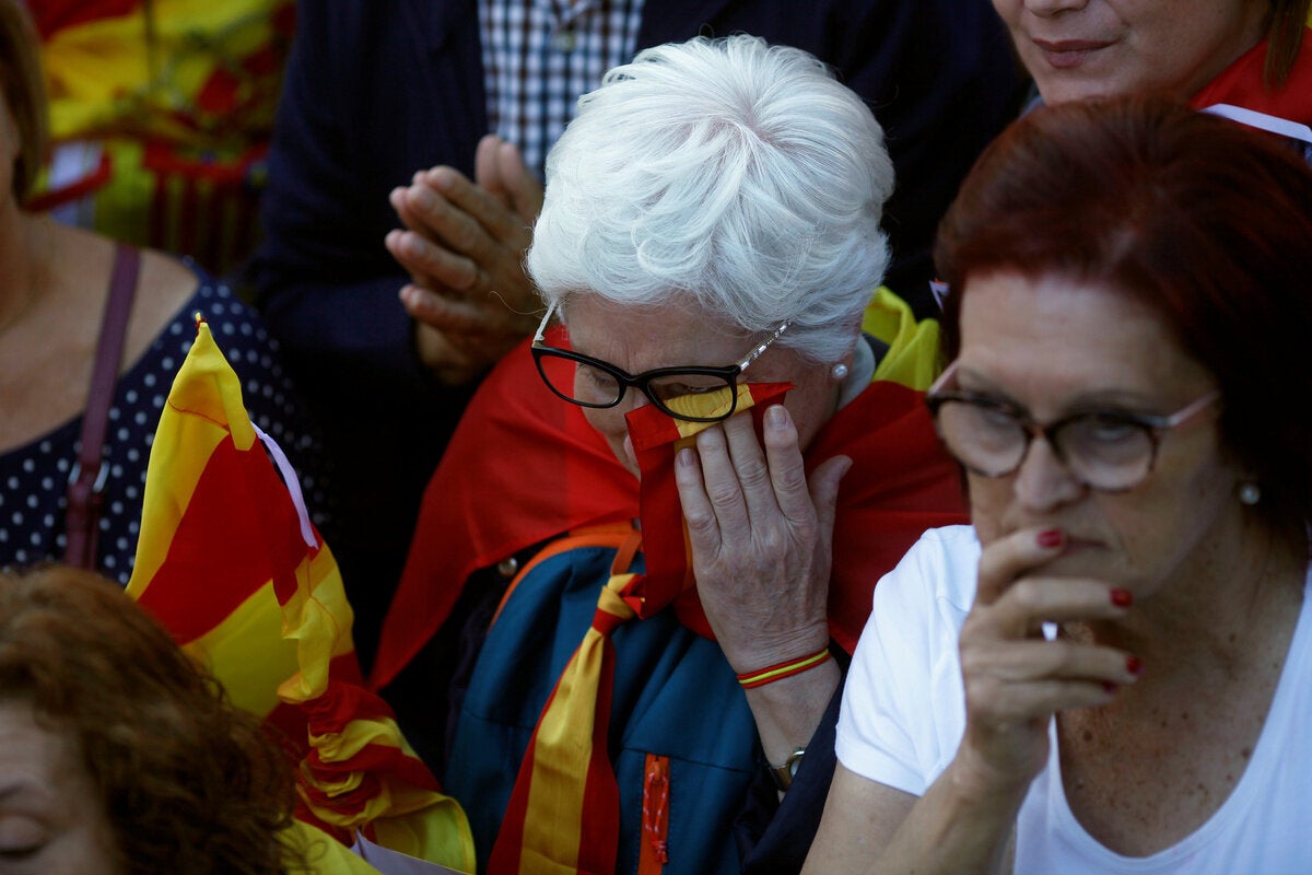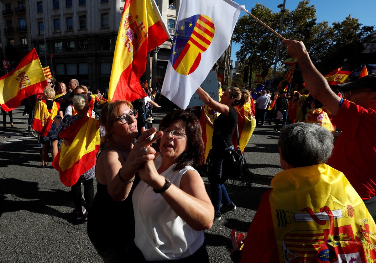 Εκατοντάδες χιλιάδες Καταλανοί οπαδοί της ενότητας της Ισπανίας διαδηλώνουν στους δρόμους της Βαρκελώνης, δύο ημέρες μετά την κήρυξη της ανεξαρτησίας από το καταλανικό κοινοβούλιο, η οποία σηματοδότησε μια πρωτοφανή ρήξη σε 40 χρόνια δημοκρατίας.