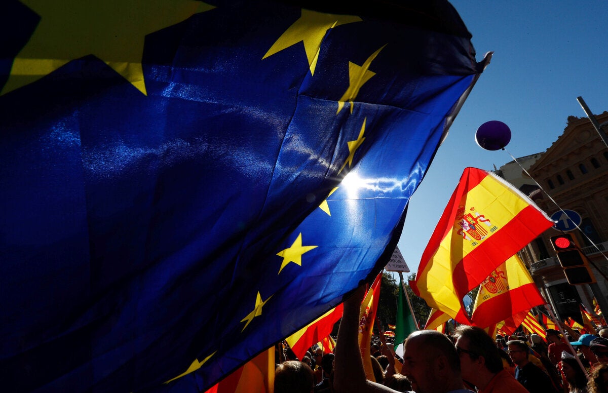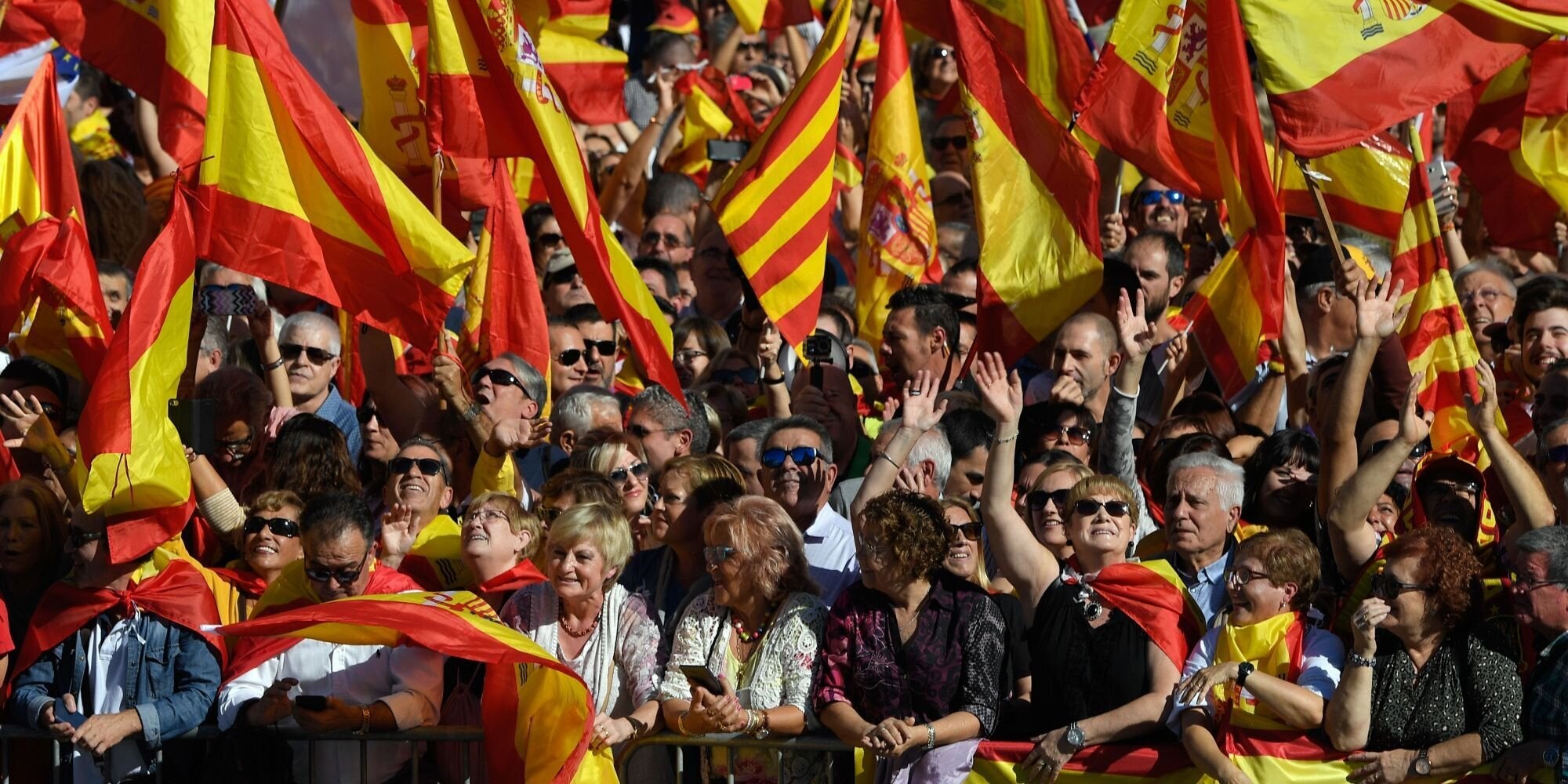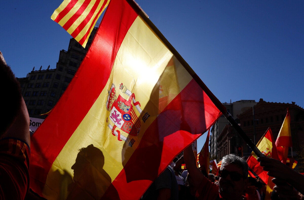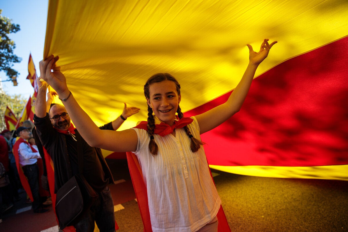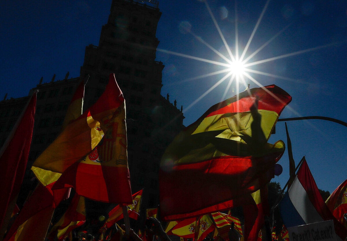 Εκατοντάδες χιλιάδες Καταλανοί οπαδοί της ενότητας της Ισπανίας διαδηλώνουν στους δρόμους της Βαρκελώνης, δύο ημέρες μετά την κήρυξη της ανεξαρτησίας από το καταλανικό κοινοβούλιο, η οποία σηματοδότησε μια πρωτοφανή ρήξη σε 40 χρόνια δημοκρατίας.