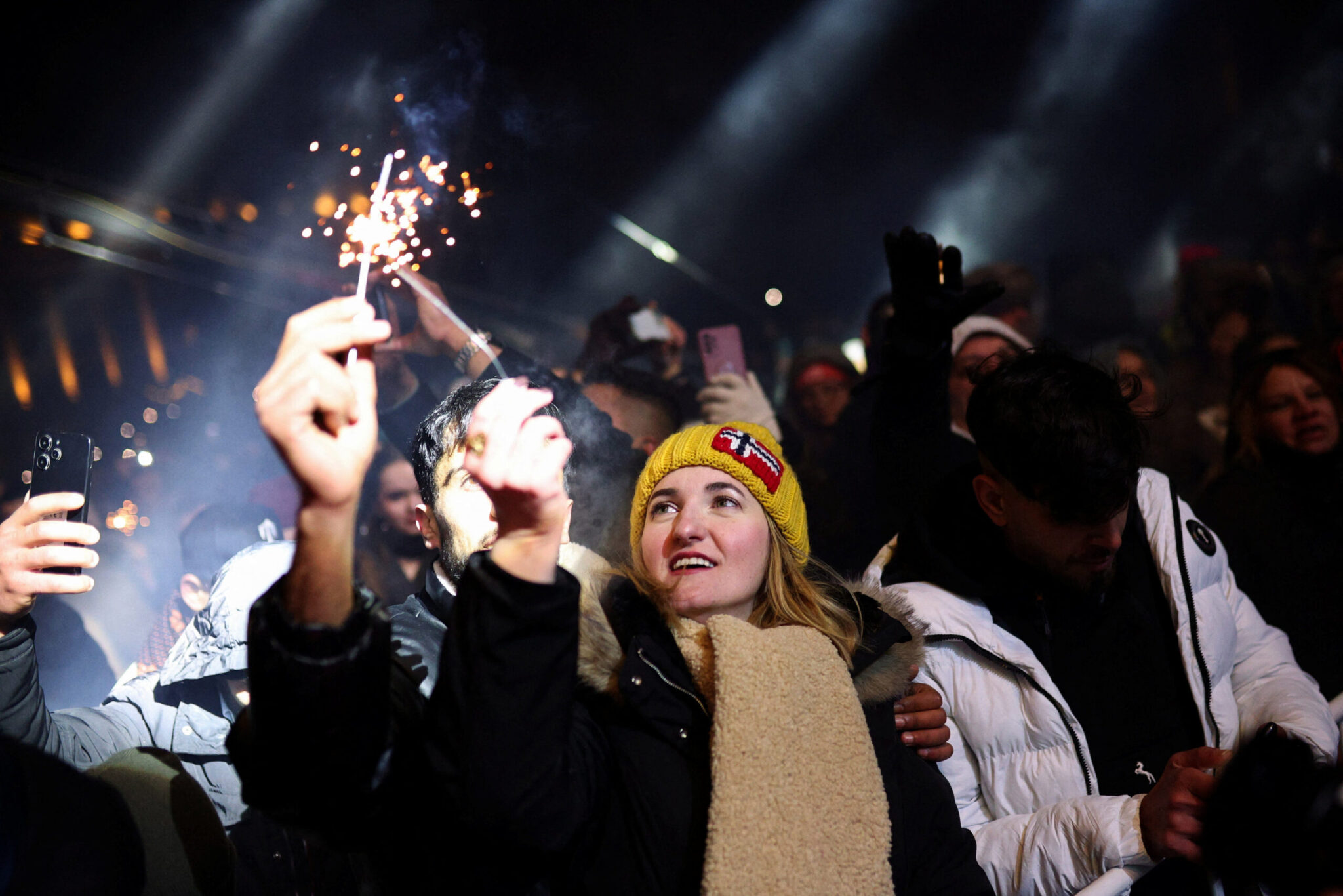 Με βεγγαλικά και πυροτεχνήματα, οι εικόνες από το κέντρο της πρωτεύουσας αποτύπωσαν το έντονα συμβολικό κλίμα της βραδιάς, όπου η αλλαγή νομίσματος συνέπεσε με την αλλαγή του χρόνου.