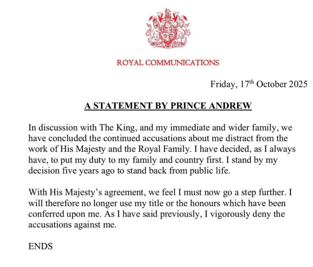 Η απόφαση έρχεται μετά από νέες αποκαλύψεις για τις σχέσεις του με τον Τζέφρι Έπσταϊν και με Κινέζους αξιωματούχους που φέρονται να εμπλέκονται σε κατασκοπεία. Ο Άντριου θα αποποιηθεί επίσης τη συμμετοχή του στο Τάγμα της Περικνημίδας, αλλά παραμένει πρίγκιπας ως γιος της βασίλισσας Ελισάβετ Β’.