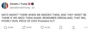 Ο Τραμπ έχει επανειλημμένα χαρακτηρίσει το ΝΑΤΟ «χάρτινο τίγρη» και έχει απειλήσει να αποσυρθεί, υποστηρίζοντας πως οι Ευρωπαίοι σύμμαχοι στο ΝΑΤΟ βασίζονται στις αμερικανικές εγγυήσεις ασφαλείας ενώ παρείχαν ανεπαρκή στήριξη στις αμερικανοϊσραηλινές επιχειρήσεις εναντίον του Ιράν.