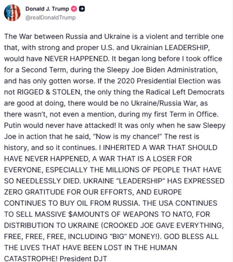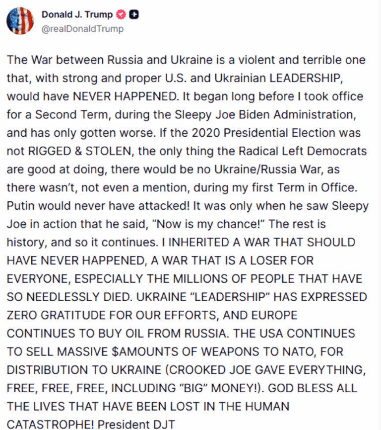 Ο πόλεμος μεταξύ Ρωσίας και Ουκρανίας είναι ένας βίαιος και τρομερός πόλεμος που, με την ισχυρή και σωστή ΗΓΕΣΙΑ των ΗΠΑ και της Ουκρανίας, ΔΕΝ ΘΑ ΕΙΧΕ ΣΥΜΒΕΙ ΠΟΤΕ. Ξεκίνησε πολύ πριν αναλάβω τη δεύτερη θητεία μου, κατά τη διάρκεια της κυβέρνησης του κοιμισμένου Μπάιντεν, και έχει μόνο επιδεινωθεί. Αν οι προεδρικές εκλογές του 2020 δεν είχαν νοθευτεί και κλαπεί, το μόνο πράγμα στο οποίο είναι καλοί οι ριζοσπάστες αριστεροί δημοκράτες, δεν θα υπήρχε πόλεμος μεταξύ Ουκρανίας και Ρωσίας, όπως δεν υπήρχε, ούτε καν αναφορά, κατά τη διάρκεια της πρώτης θητείας μου.