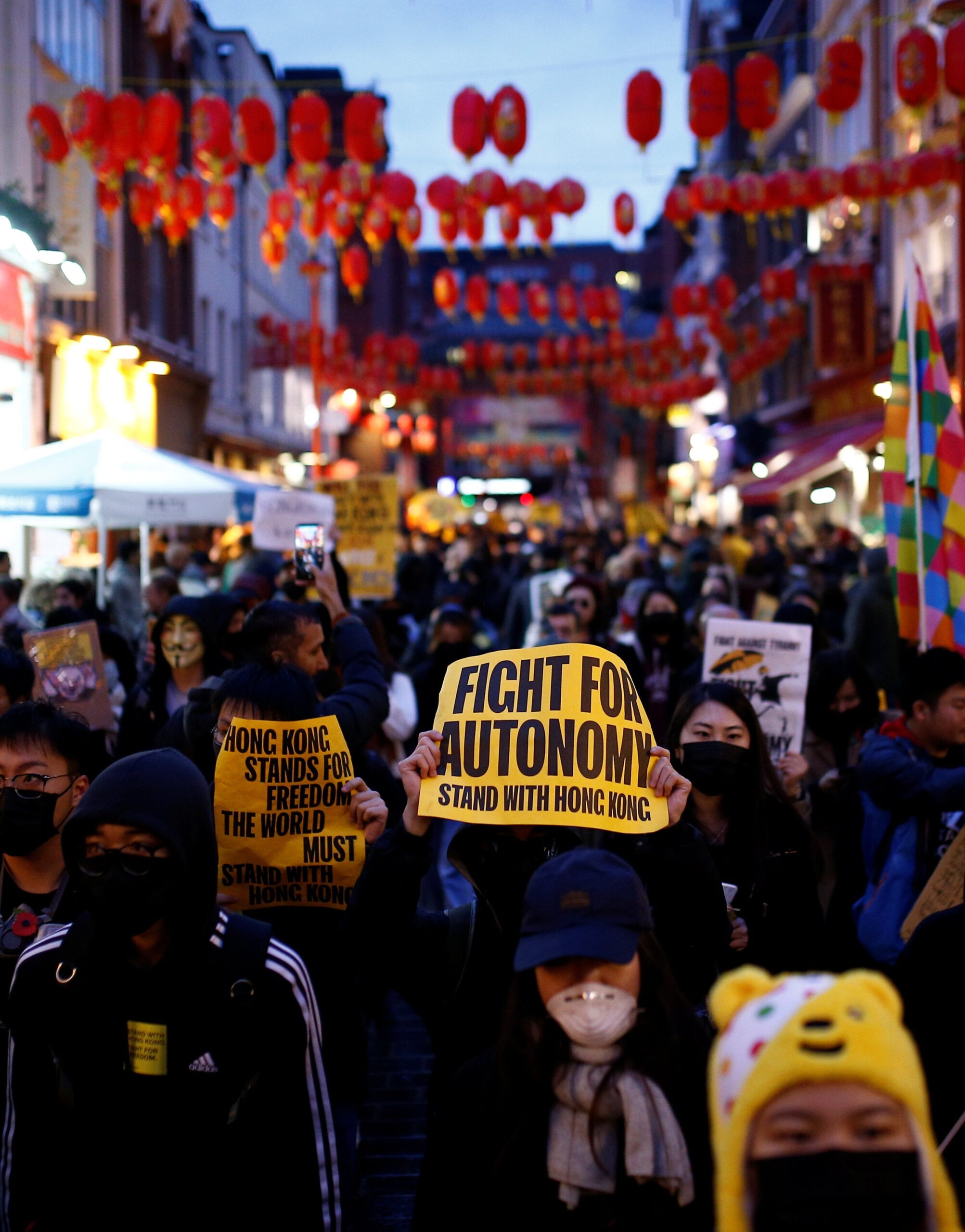 Πολλοί διαδηλωτές έψαλαν τον βρετανικό και τον αμερικανικό εθνικό ύμνο κυματίζοντας σημαίες πολλών εθνών, ενώ λίγοι άλλοι φώναζαν συνθήματα υπέρ της ανεξαρτησίας, κάτι το οποίο αποτελεί την κόκκινη γραμμή για τους ηγέτες του Κινεζικού Κομμουνιστικού Κόμματος στο Πεκίνο, οι οποίοι έχουν ορκιστεί να «συνθλίψουν» όποιον προβάλει μια τέτοια αξίωση.