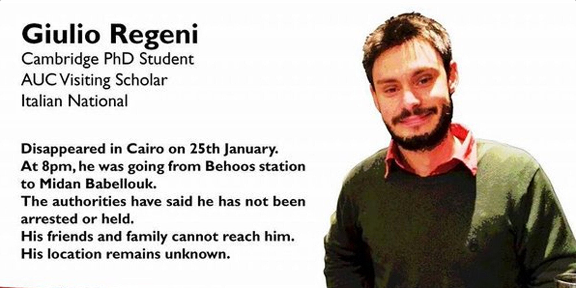 Στο σημείο αυτό να αναφέρουμε ότι ο Regeni εθεάθη για τελευταία φορά την 25η Ιανουαρίου έξω από το σπίτι του και, σύμφωνα με μαρτυρίες, ετοιμαζόταν να πάρει μετρό για να συναντήσει κάποιον φίλο του στο κέντρο της πόλης.