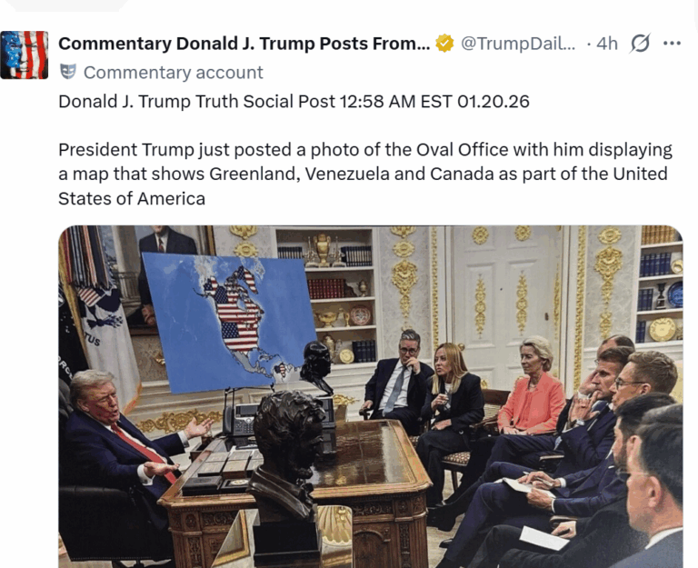Στο μεταξύ, από την άλλη πλευρά του Ατλαντικού, ο Ντόναλντ Τραμπ δείχνει να αντιμετωπίζει τις ευρωπαϊκές ανησυχίες με ειρωνική διάθεση. Σε αναρτήσεις του, εμφανίζεται να «ενσωματώνει» τη Γροιλανδία σε χάρτες των Ηνωμένων Πολιτειών, σαρκάζοντας εμμέσως τις έκτακτες ευρωπαϊκές συσκέψεις, τις κοινές δηλώσεις και τις τηλεφωνικές διπλωματικές πρωτοβουλίες. Την ίδια ώρα, ανακοίνωσε ότι είχε «πολύ καλή» τηλεφωνική επικοινωνία με τον γενικό γραμματέα του ΝΑΤΟ Μαρκ Ρούτε και ότι συμφωνήθηκε η πραγματοποίηση συνάντησης «των διαφόρων εμπλεκόμενων πλευρών» στο περιθώριο του Παγκόσμιου Οικονομικού Φόρουμ στο Νταβός, χωρίς ωστόσο να διευκρινίζει ποιοι ακριβώς θα συμμετάσχουν. Παράλληλα, επανέλαβε ότι η Γροιλανδία είναι «απολύτως κρίσιμη για την εθνική και παγκόσμια ασφάλεια», προσθέτοντας πως «δεν υπάρχει επιστροφή».