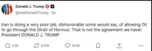 Σε μία από τις αναρτήσεις του στo Truth Social ο Ντόναλντ Τραμπ σημείωσε πως: «Το Ιράν κάνει πολύ κακή δουλειά -και κάποια θα έλεγαν ανέντιμη- στο να επιτρέπει να περνά το πετρέλαιο από τα Στενά του Ορμούζ. Δεν είναι αυτό η συμφωνία που έχουμε!».