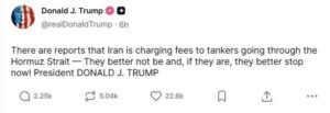 Σε άλλη ανάρτησή του μιλά για τα «διόδια» που φαίνεται να έχουν επιβάλει ατύπως οι Ιρανοί για τα πλοία που διέρχονται από τα Στενά του Ορμούζ, χωρίς πάντως να προχωρά σε απειλές αν δεν το πράξουν.