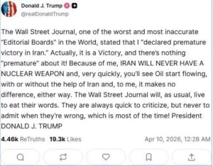 Ο Ντόναλντ Τραμπ έγραψε: «Η Wall Street Journal, ένα από τα χειρότερα και πιο ανακριβή ομάδα συντακτών στον κόσμο, δήλωσε ότι «κήρυξα πρόωρη νίκη στο Ιράν». Στην πραγματικότητα, πρόκειται για νίκη και δεν υπάρχει τίποτα «πρόωρο» σε αυτό! Εξαιτίας μου, το Ιράν δεν θα αποκτήσει ποτέ πυρηνικά όπλα και, πολύ σύντομα, θα δείτε το πετρέλαιο να ρέει, με ή χωρίς τη βοήθεια του Ιράν – για μένα δεν κάνει καμία διαφορά, έτσι κι αλλιώς. Η Wall Street Journal, όπως συνήθως, θα ζήσει για να «καταπιεί τα λόγια της». Είναι πάντα γρήγοροι στο να ασκούν κριτική, αλλά ποτέ στο να παραδέχονται όταν κάνουν λάθος, κάτι που συμβαίνει τις περισσότερες φορές!».