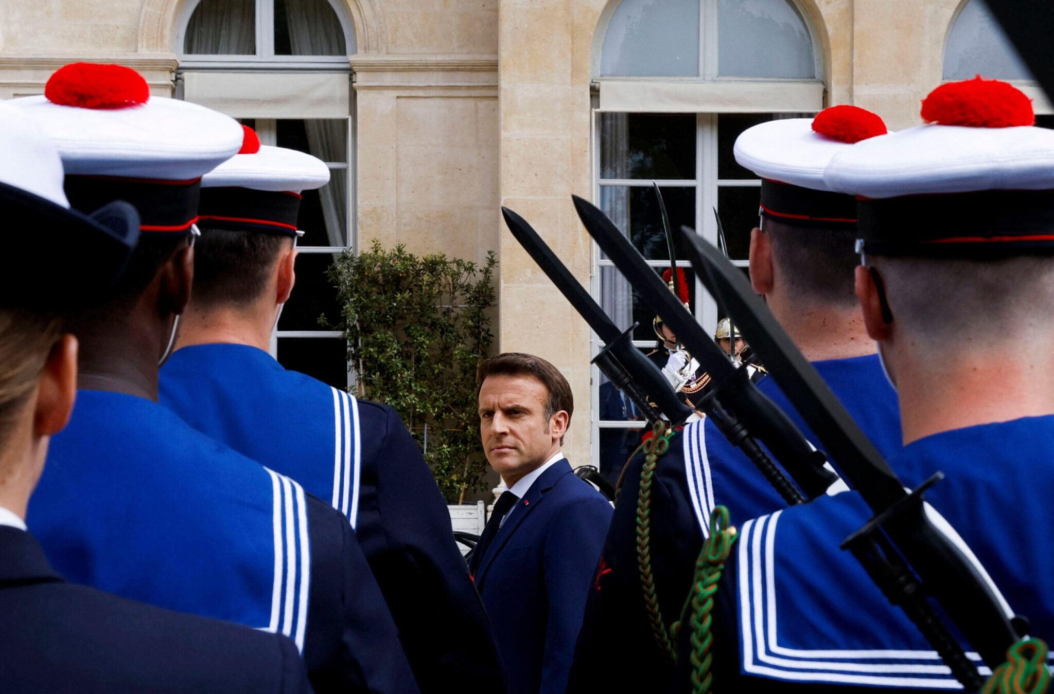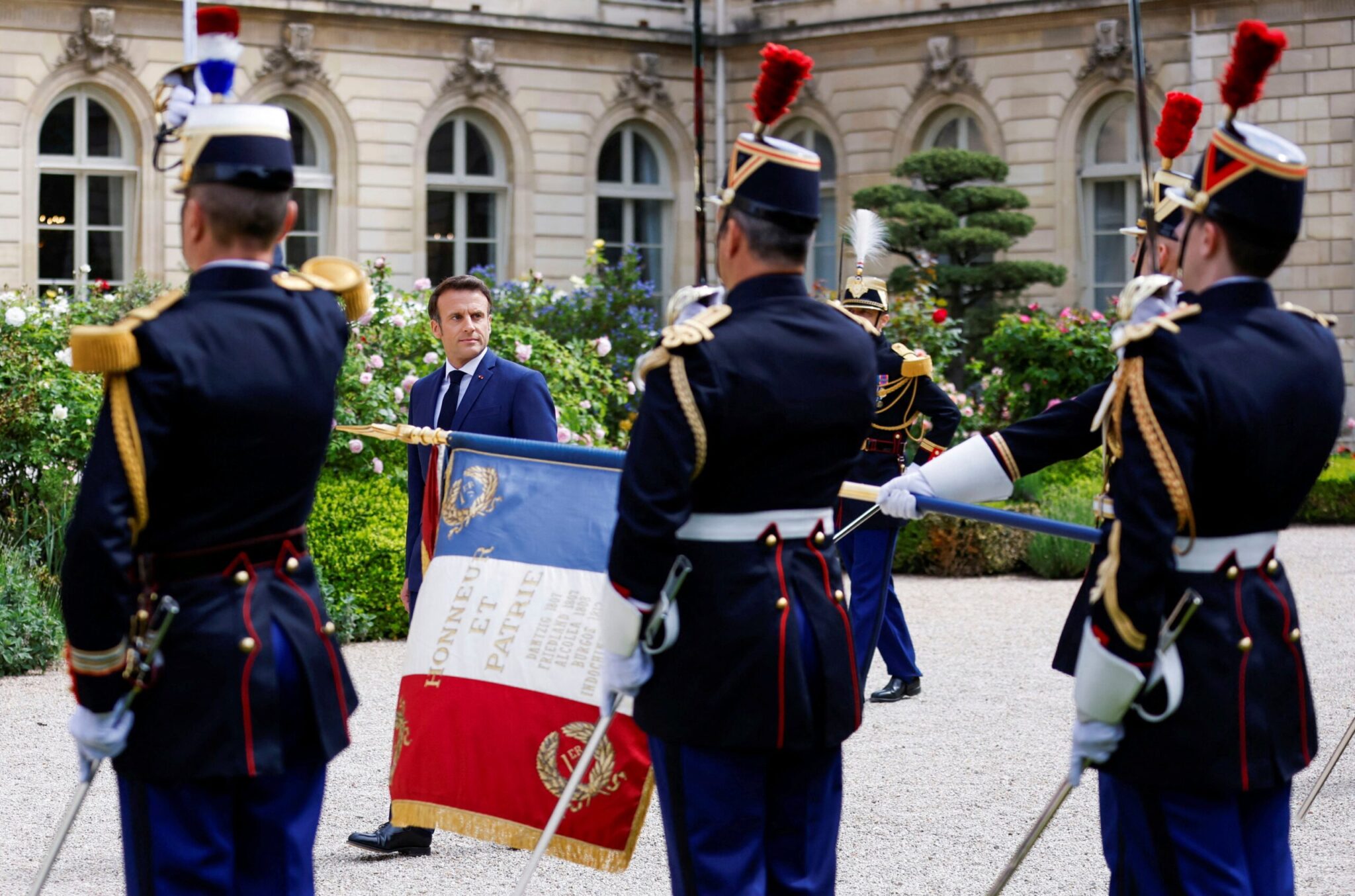 Ο Γάλλος πρόεδρος Εμανουέλ Μακρόν επιθεωρεί στρατιωτικό άγημα κατά την  τελετή ορκωμοσίας, στο παλάτι των Ηλυσίων, στο Παρίσι, το Σάββατο 7 Μαΐου 2022. Lewis Joly via AP