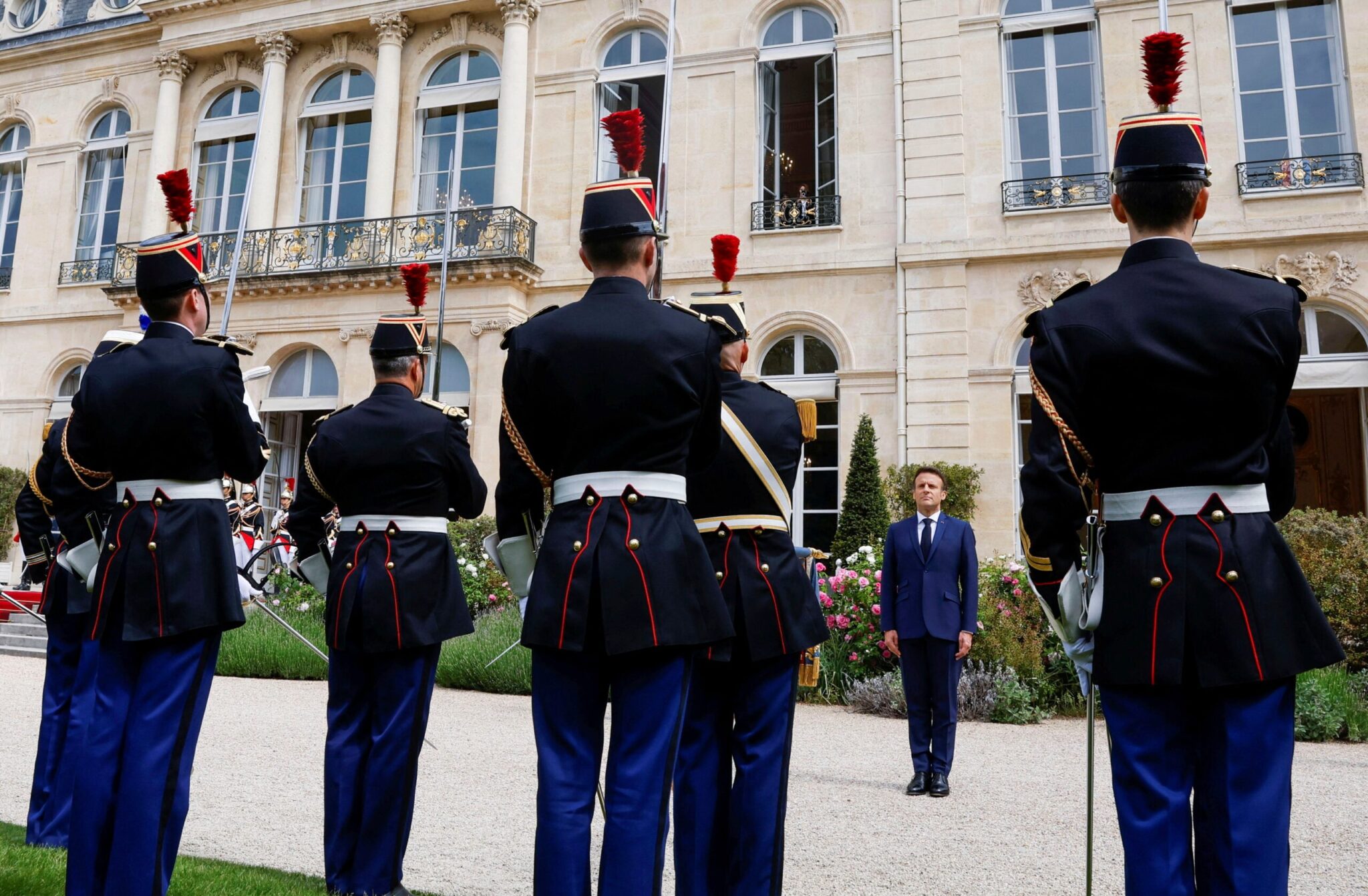 Ο Γάλλος πρόεδρος Εμανουέλ Μακρόν επιθεωρεί στρατιωτικό άγημα κατά την τελετή της ορκωμοσίας, στο παλάτι των Ηλυσίων, στο Παρίσι, το Σάββατο 7 Μαΐου 2022. Gonzalo Fuentes via AP