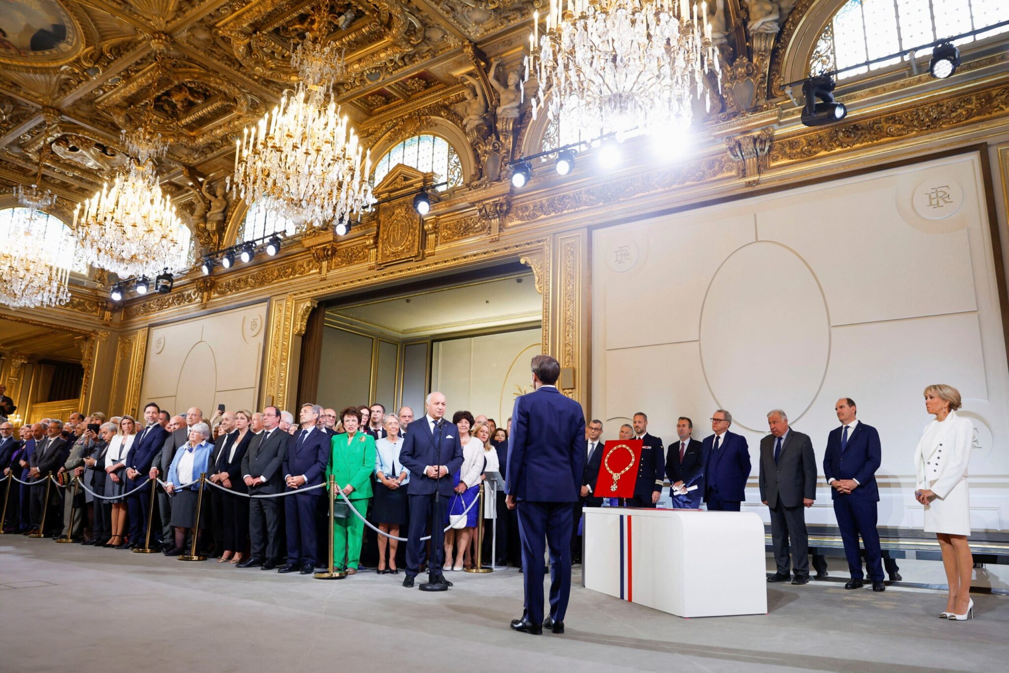 Ακολουθώντας πιστά ένα πρωτόκολλο οι ρίζες του οποίου βρίσκονται στις περιόδους της μοναρχίας, αλλά και με νεωτερισμούς, όπως η παρουσία στην τελετή σχεδόν 500 καλεσμένων οι περισσότεροι από τους οποίους δεν ήταν ιδιαίτερα γνωστοί στο ευρύ κοινό, αλλά επελέγησαν προσωπικά από τον πρόεδρο, ο επανεκλεγείς Εμανουέλ Μακρόν άκουσε τον πρόεδρο του Συνταγματικού Συμβουλίου της Γαλλίας να τον ανακηρύσσει νικητή των εκλογών.