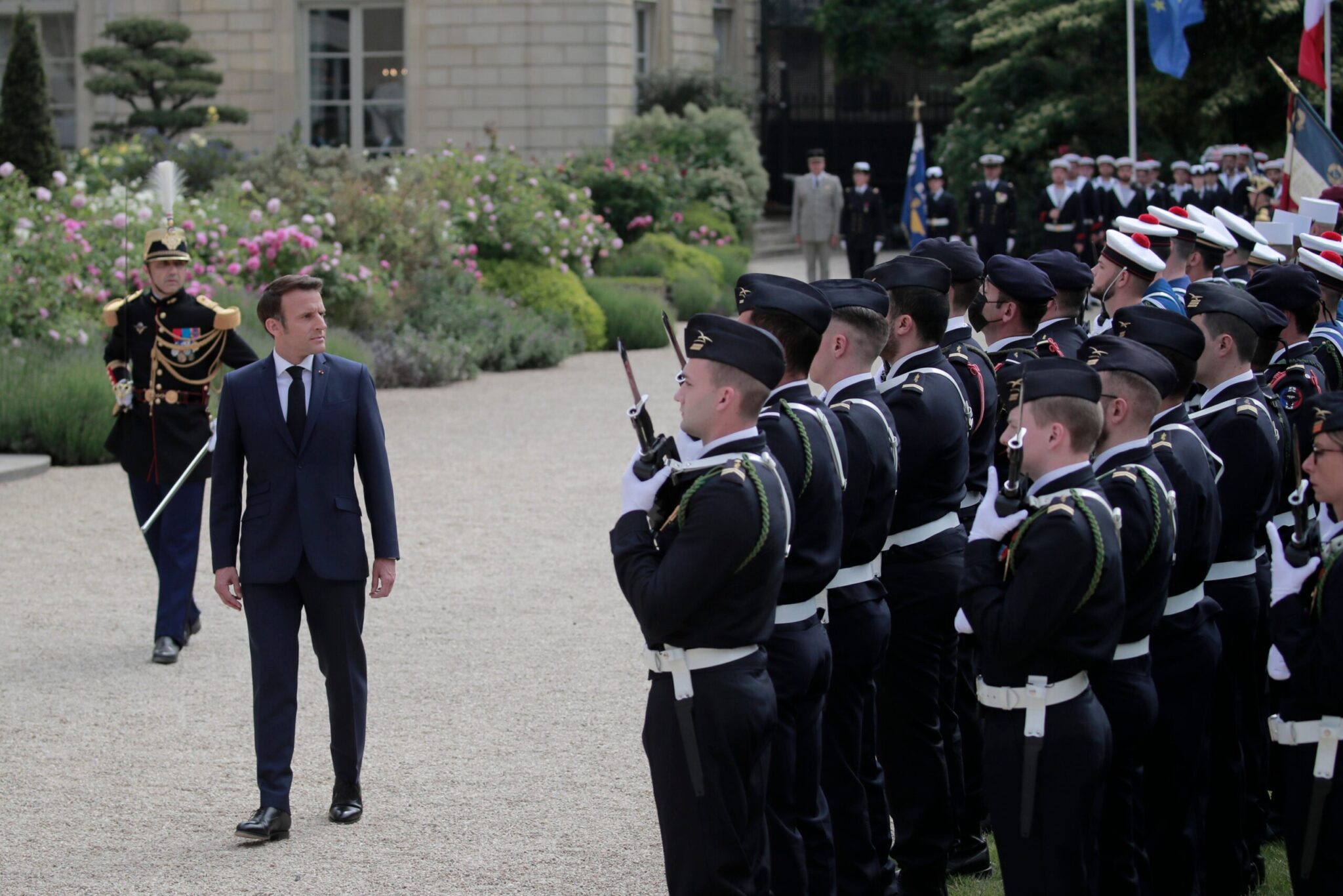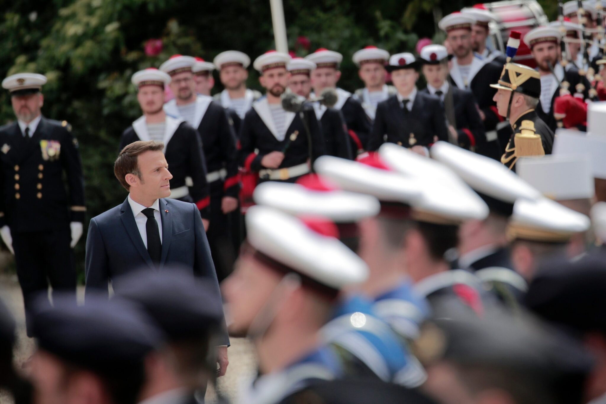 Ο Γάλλος πρόεδρος Εμανουέλ Μακρόν επιθεωρεί στρατιωτικό άγημα κατά την τελετή ορκωμοσίας, στο παλάτι των Ηλυσίων, στο Παρίσι, το Σάββατο 7 Μαΐου 2022. Lewis Joly via AP