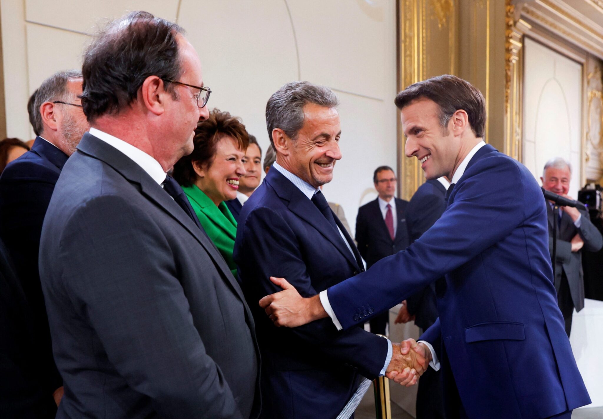Οι πρώην πρόεδροι της Γαλλίας Φρανσουά Ολάντ και Νικολά Σαρκοζί, στέκονται δίπλα στην υπουργό Πολιτισμού Ροζελίν Μπασελό και την υπουργό Εργασίας,  Ελίζαμπεθ Μπορν, στην τελετή ορκωμοσίας του Γάλλου Προέδρου Εμανουέλ Μακρόν, στο παλάτι των Ηλυσίων στο Παρίσι, Γαλλία , Σάββατο, 7 Μαΐου 2022. Gonzalo Fuentes via AP