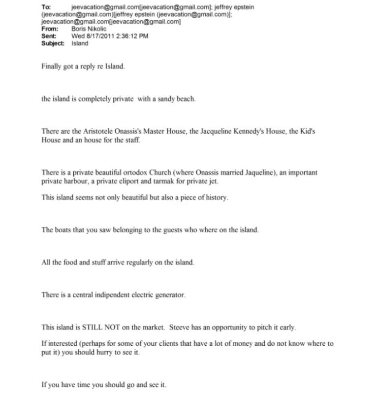 Από τα emails προκύπτει ότι ο Επστάιν ζητούσε πληροφορίες για το καθεστώς ιδιοκτησίας, την πρόσβαση στις ακτές και τις δυνατότητες μετακίνησης, όπως το πλησιέστερο αεροδρόμιο και μεταφορά με ελικόπτερο. Αν και το νησί δεν ήταν προς πώληση, επιχείρησε να κινηθεί μέσω επαφών που είχαν πρόσβαση σε δίκτυα πολυτελών ακινήτων.