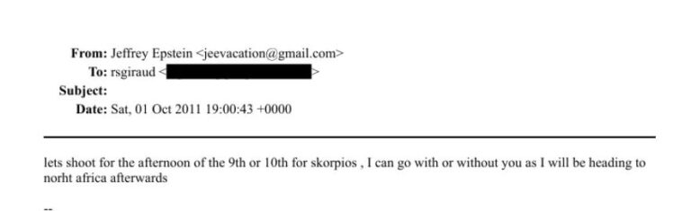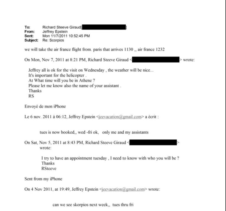 Από τον Αύγουστο έως το τέλος του 2011, ο Τζέφρι Επστάιν φέρεται να είχε ανοίξει συζητήσεις για τον Σκορπιό, το ιστορικό νησί του Αριστοτέλη Ωνάση, σύμφωνα με αλληλογραφία που ήρθε στο φως από περίπου 3.000.000 έγγραφα του αμερικανικού Υπουργείου Δικαιοσύνης.