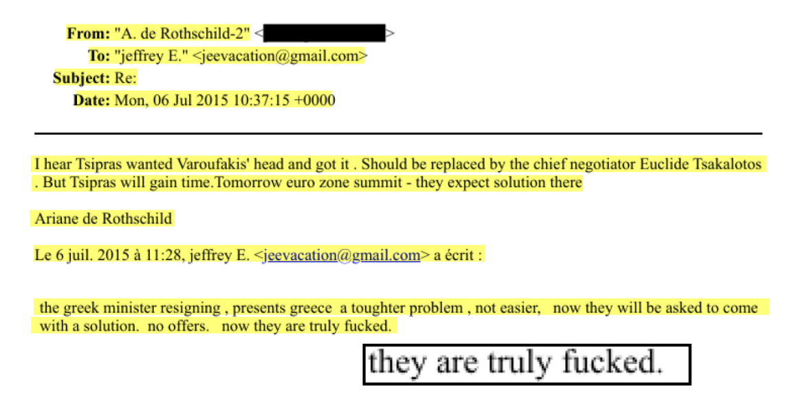 Σύμφωνα με τα έγγραφα, στις 6 Ιουλίου 2015 —λίγες ώρες μετά την ανακοίνωση του αποτελέσματος του ελληνικού δημοψηφίσματος και την παραίτηση του τότε υπουργού Οικονομικών Γιάνη Βαρουφάκη— καταγράφεται ηλεκτρονική αλληλογραφία μεταξύ της Αριάν ντε Ρότσιλντ και του Τζέφρι Έπσταϊν.