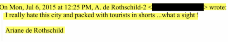 Στην ίδια αλληλογραφία η Αριάν ντε Ρότσιλντ εμφανίζεται να γράφει προς τον Έπσταιν πως ο υπερτουρισμός της Ελληνικής Πρωτεύουσας της δημιουργεί απέχθεια…