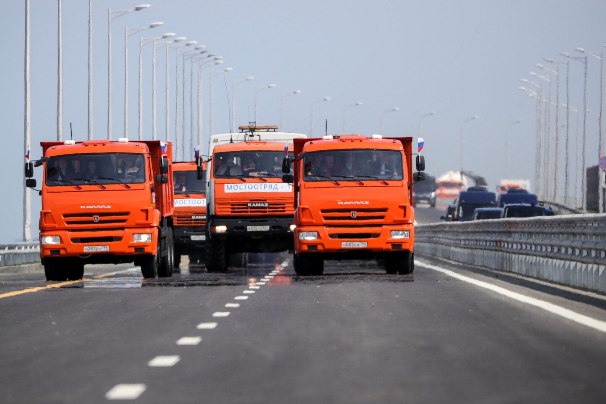 Το φορτηγό, με οδηγό τον Πρόεδρο Πούτιν τον οποίο συνόδευε ο επικεφαλής του έργου κατασκευής της γέφυρας Αλεξάντρ Οστρόφσκι, τέθηκε επικεφαλής της πομπής αυτοκινήτων και μηχανημάτων που είχαν χρησιμοποιηθεί για την κατασκευή της γέφυρας Η αυτοκινητοπομπή, αποτελούμενη από 36 οχήματα, ξεκίνησε από την πλευρά της Ρωσίας, διανύοντας 19 χιλιόμετρα της γέφυρας, για να φθάσει στο έδαφος της Κριμαίας μετά από περίπου 20 λεπτά. Μόλις έφθασε, ο πρόεδρος Πούτιν κατέβηκε από το φορτηγό και απηύθυνε χαιρετισμό σε όλους όσοι είχαν συμμετάσχει στην κατασκευή της γέφυρας και είχαν συγκεντρωθεί για να γιορτάσουν τα εγκαίνιά της με μια συναυλία στην οποία συμμετείχαν γνωστοί Ρώσοι ερμηνευτές.