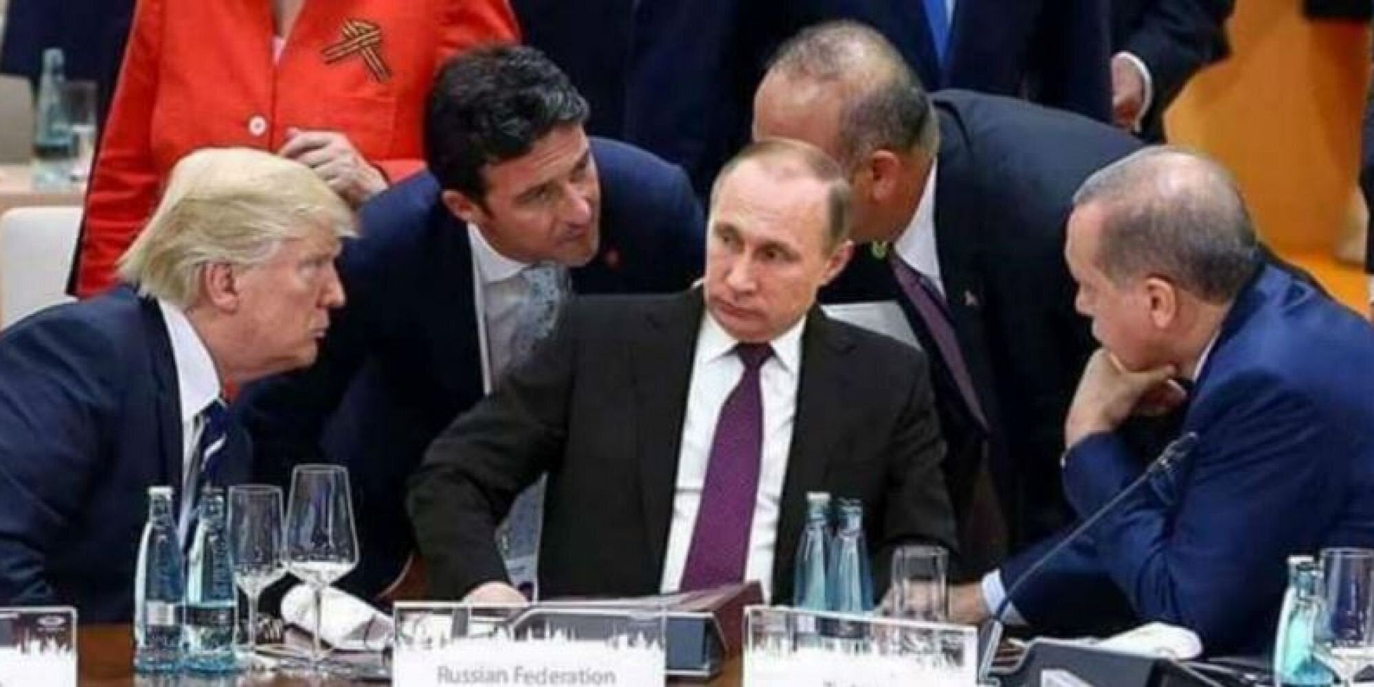 Ο «τσάρος» βρίσκεται στο κέντρο της φωτογραφίας, περιστοιχισμένος από τον Ντόναλντ Τραμπ, τον Ρετζέπ Ταγίπ Ερντογάν και άλλους ηγέτες. Φαίνεται πως όλοι τους περιμένουν ανυπόμονα να ακούσουν τι έχει να πει ο Πούτιν, ενώ στο φόντο μπορεί να διακρίνει κανείς την Γερμανίδα καγκελάριο, Άνγκελα Μέρκελ, να κρυφακούει την συνομιλία.