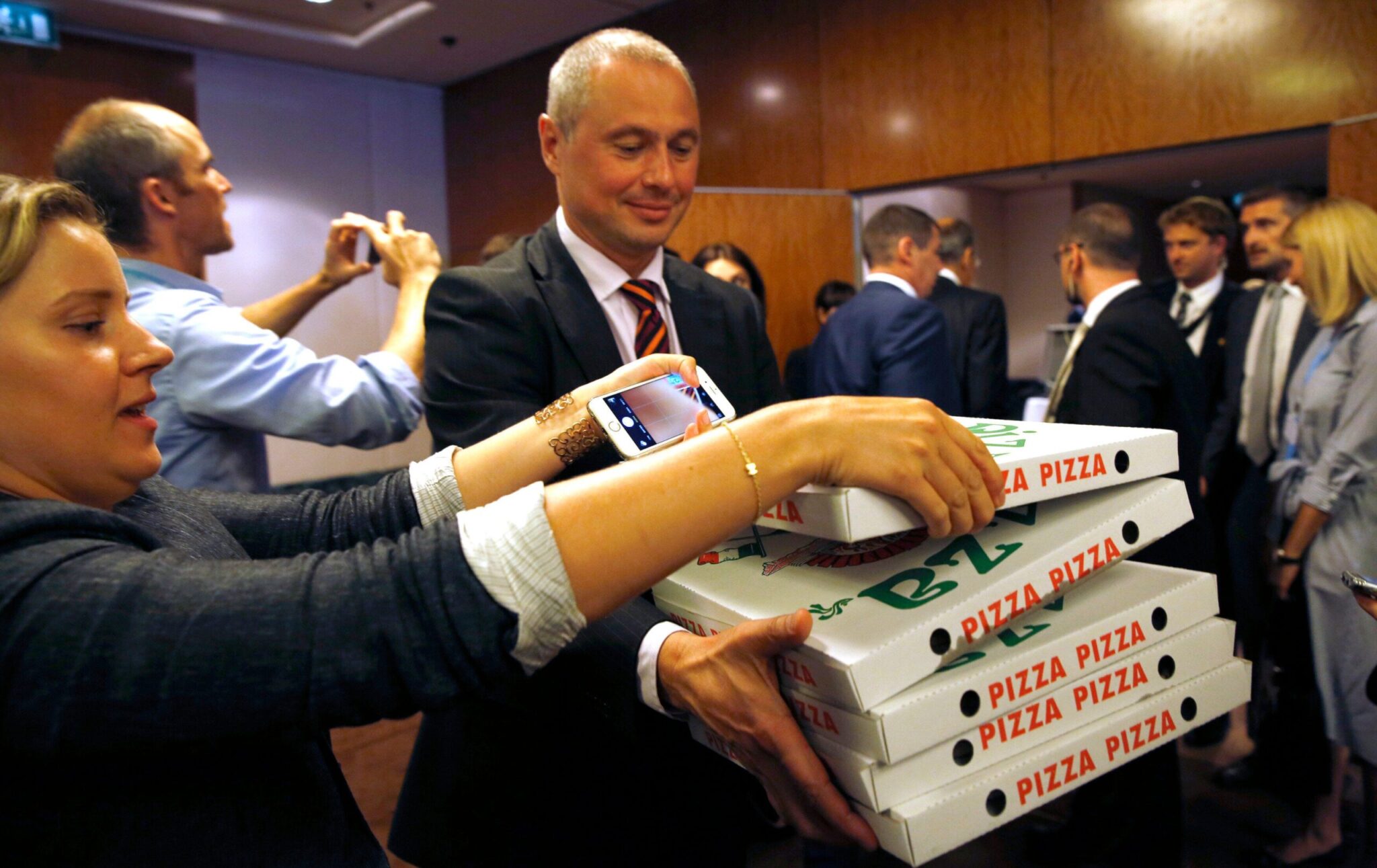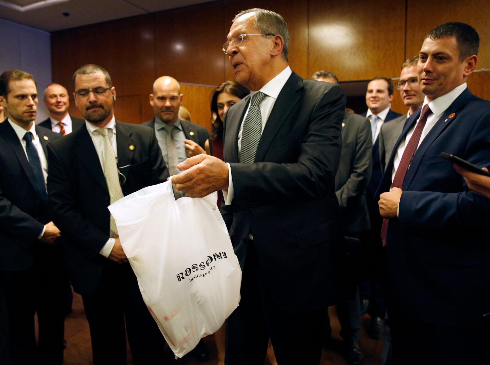 Περίπου μία ώρα αργότερα, ο Λαβρόφ εμφανίστηκε ξανά για να ταΐσει τους πεινασμένους για ειδήσεις δημοσιογράφους – κατά κυριολεξία: συνοδευόταν από συνεργάτες του, ο ένας από τους οποίους κουβάλαγε μια μεγάλη στοίβα κουτιά με πίτσες, που ανακοίνωσε πως ήταν δώρο «της αμερικανικής αντιπροσωπείας».