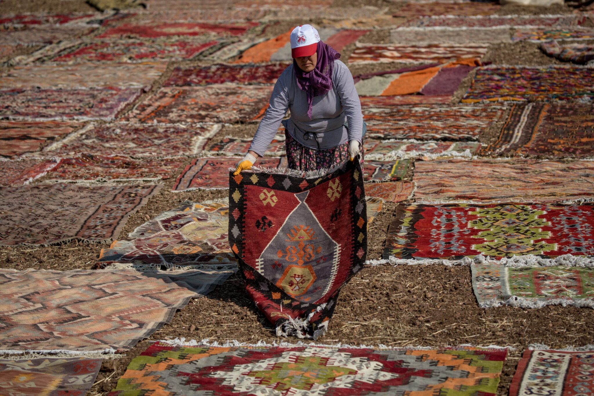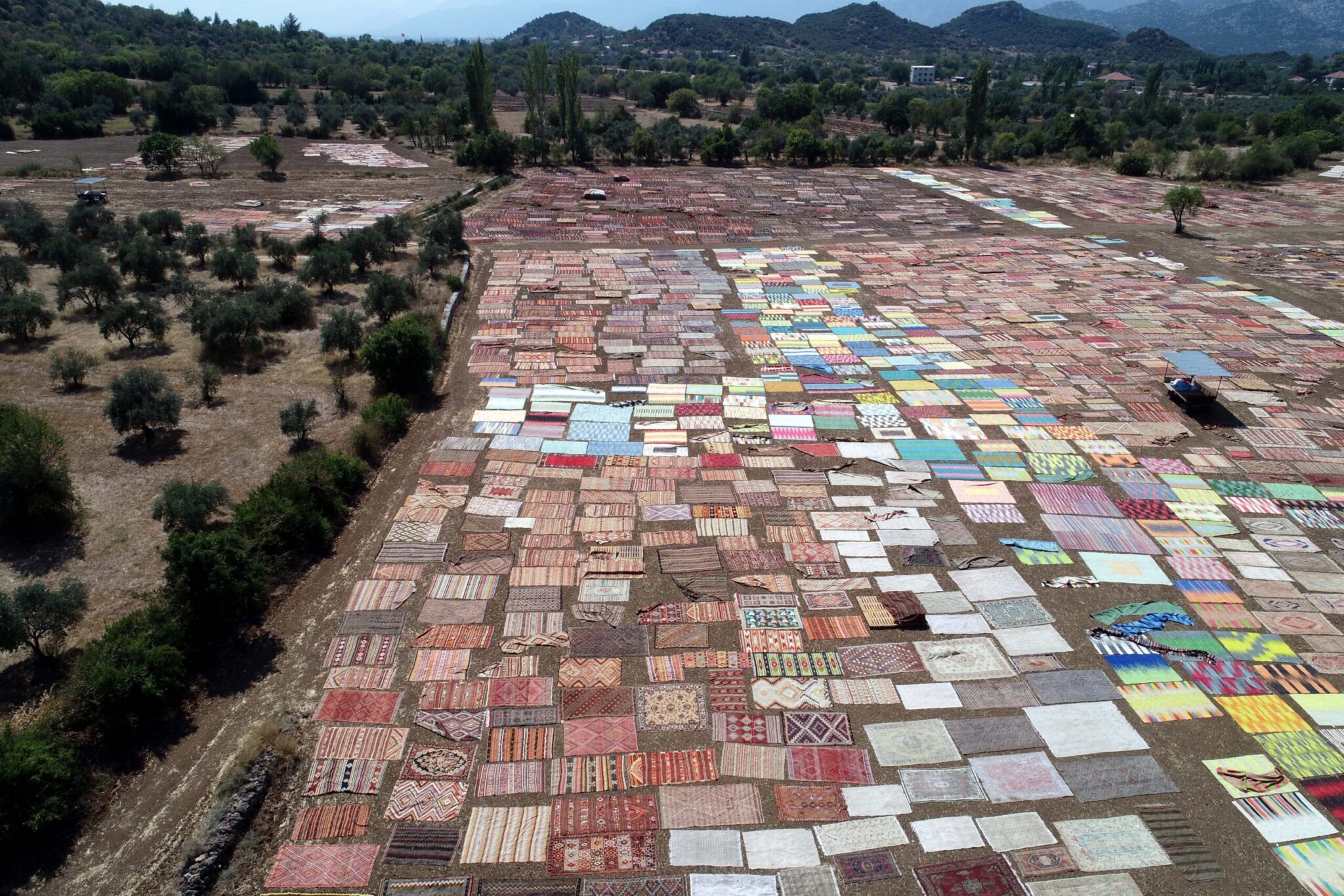 Χιλιάδες χειροποίητα χαλιά στρωμένα στο χώμα, στην περιοχή Ντοσεμάλτ, στην επαρχία της Αττάλειας του τουρκικού νότου, περιμένουν τον ήλιο να απαλύνει τα χρώματά τους. Οι φωτογραφίες που τραβήχτηκαν από drone, αποτυπώνουν ένα μοναδικό – και εφήμερο – έργο τέχνης.