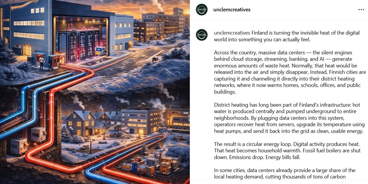 Χωρίς μεγάλες δηλώσεις ή εντυπωσιακές καμπάνιες, η Φινλανδία έχει δημιουργήσει μία από τις πιο κομψές και πρακτικές κλιματικές λύσεις παγκοσμίως. Αποδεικνύει ότι ακόμη και η ενέργεια που τροφοδοτεί το διαδίκτυο — την πιο «άυλη» υποδομή της εποχής μας — μπορεί να ανακυκλωθεί και να κρατήσει ολόκληρες πόλεις ζεστές.