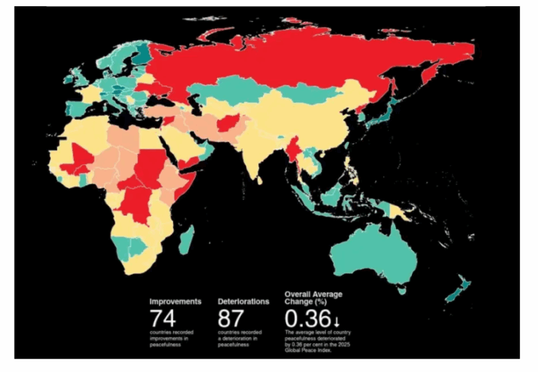 Το 2025 καταγράφεται ως χρονιά πολεμικών συγκρούσεων, εμπορικών εντάσεων και έντονης στρατικοποίησης. Σύμφωνα με τον Παγκόσμιο Δείκτη Ειρήνης (Global Peace Index – GPI), ο αριθμός των κρατικών συγκρούσεων βρίσκεται στο υψηλότερο επίπεδο από τον Δεύτερο Παγκόσμιο Πόλεμο, με τρεις νέες συγκρούσεις να ξεσπούν μόνο φέτος. Μέσα σε αυτό το περιβάλλον, η ειρήνη αναδεικνύεται σε ιδιαίτερα πολύτιμο αγαθό, με αρκετές χώρες να εξακολουθούν να την θέτουν σε απόλυτη προτεραιότητα.