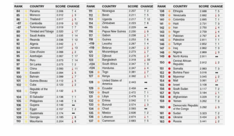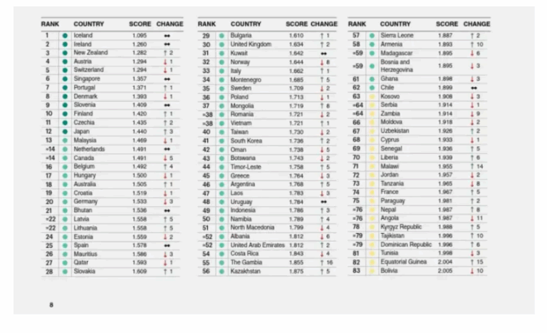 Στον αντίποδα, στην τελευταία θέση είναι η Ρωσία, κάτω και από Ουκρανία, Σουδάν, Κονγκό, Υεμένη και Αφγανιστάν.