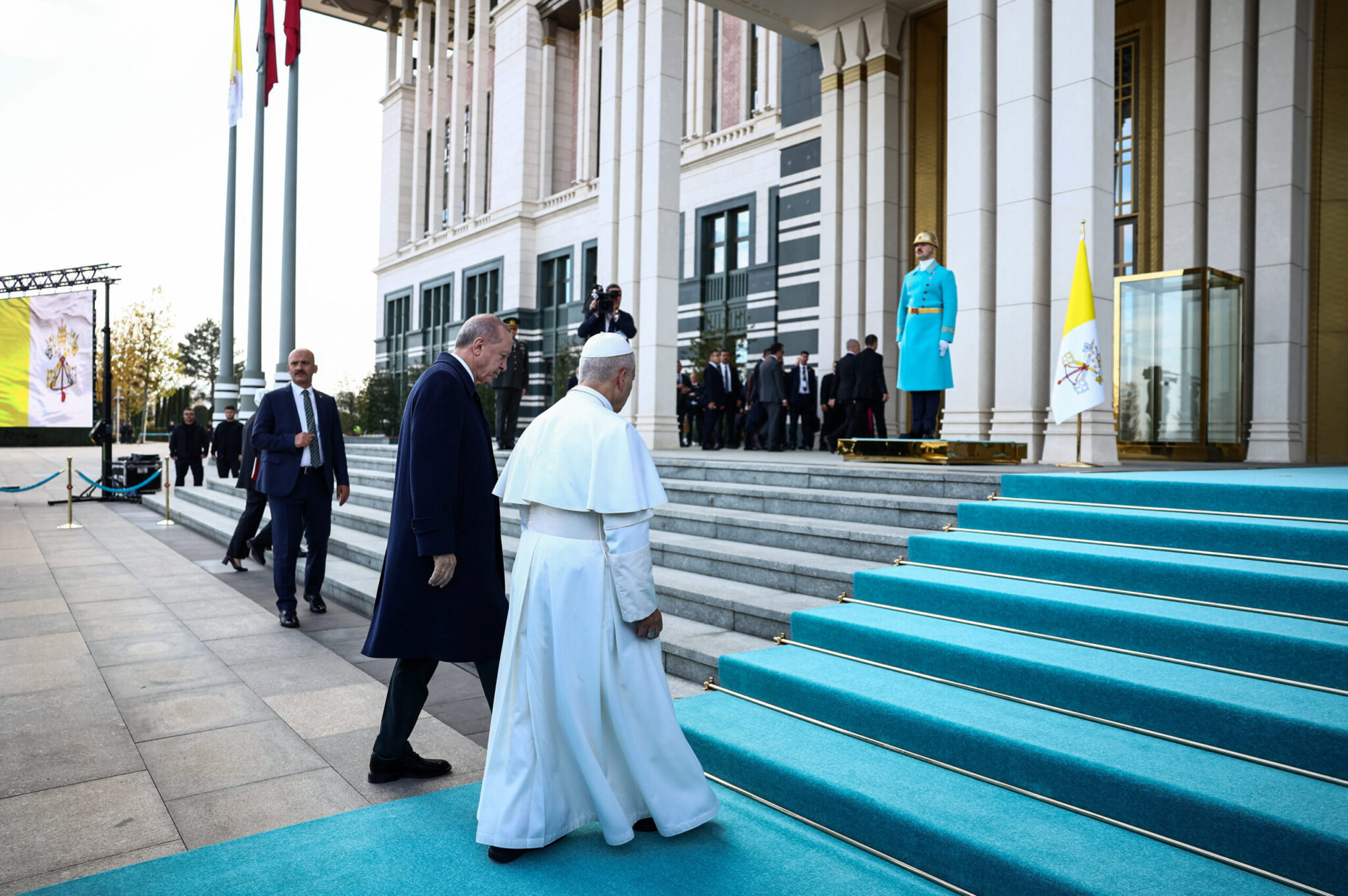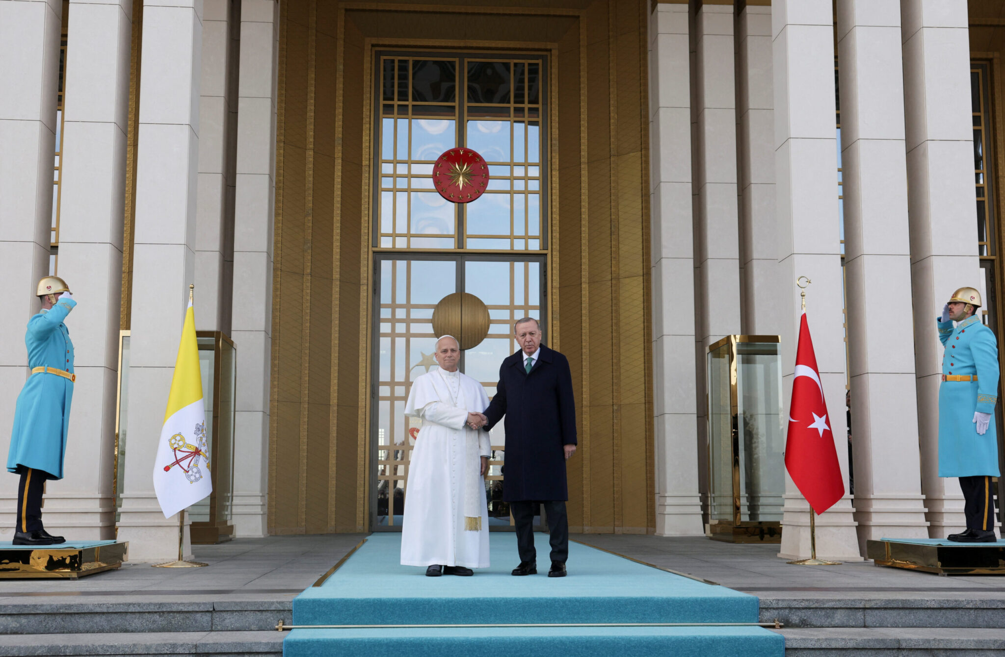 Ο Ερντογάν υποδέχτηκε τον Πάπα Λέοντα στην κύρια είσοδο του Προεδρικού Μεγάρου. Αφού ο Πρόεδρος Ερντογάν και ο Πάπας Λέων πήραν τις θέσεις τους, ακούστηκαν οι εθνικοί ύμνοι των δύο χωρών, συνοδευόμενοι από 21 κανονιοβολισμούς.